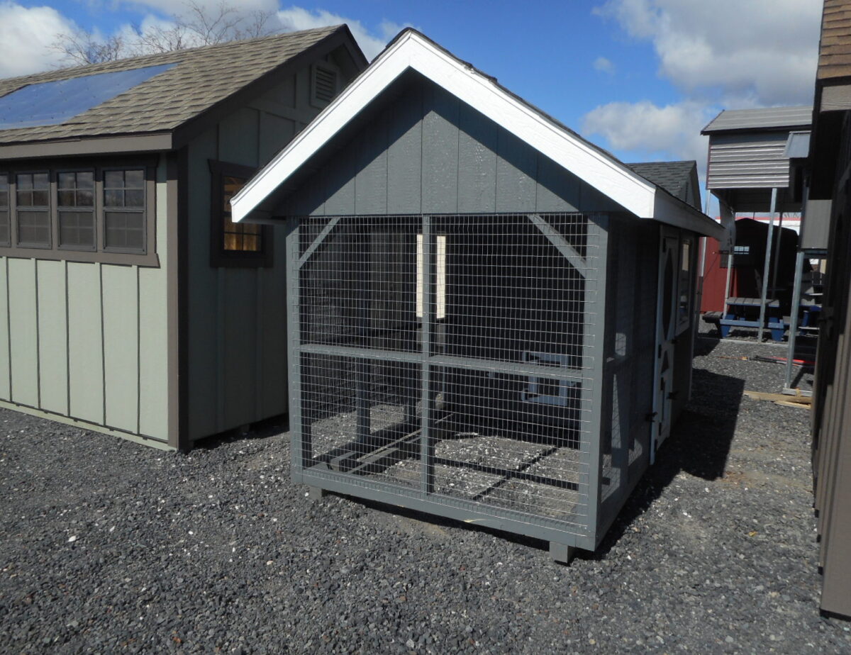 This model includes 8″ roof overhangs, 1×6 face boards, three easy open windows, an access door to the interior, an access door to the exterior run, a turn-out door from the interior to exterior run, a turn-out door from the exterior run to the outside, three nesting boxes with an exterior access door, and small exterior storage area for feed. The interior area is 6′ x 5′ and the exterior run area is 6′ x 7′.