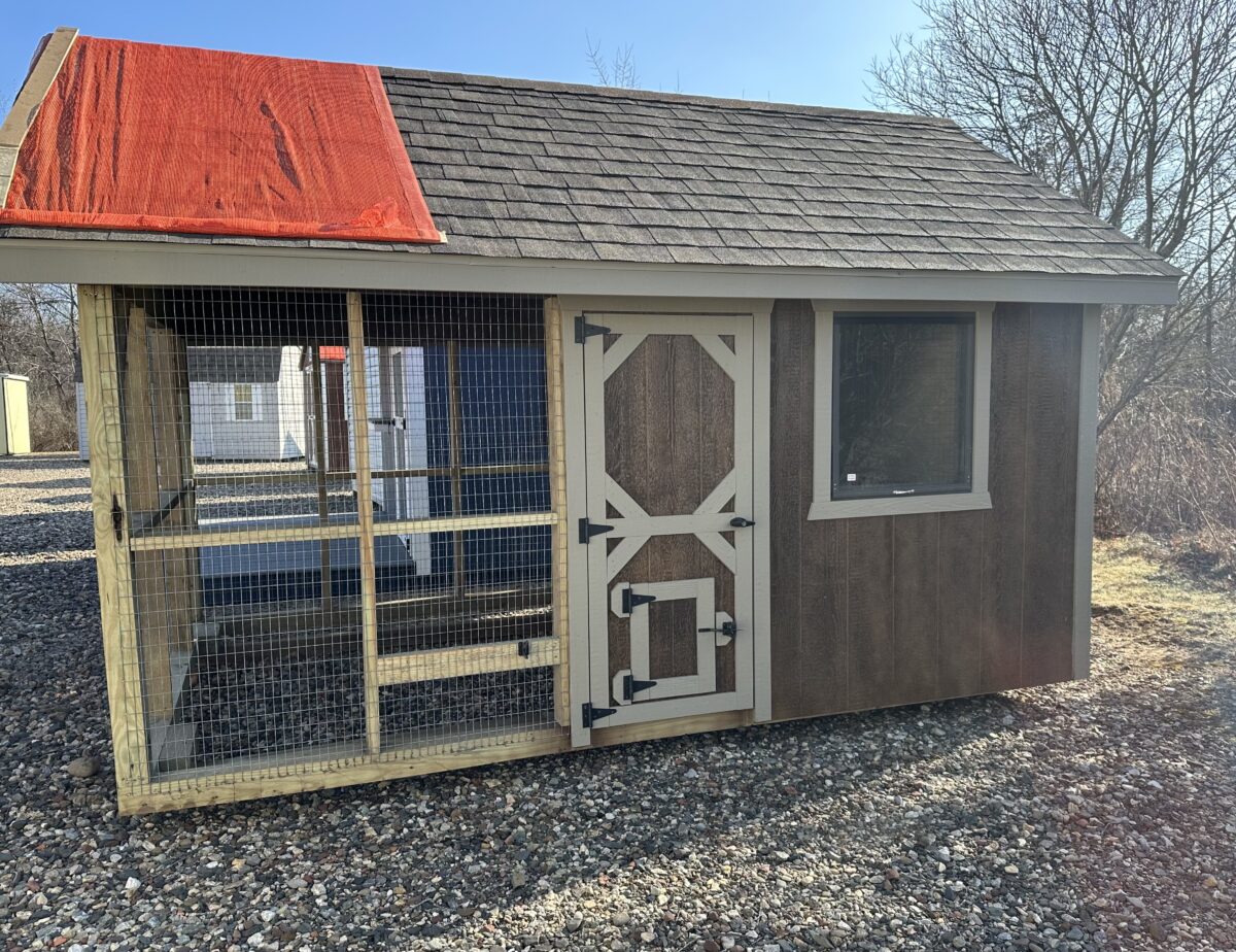 Amish-Tough Construction: Built with 50-year LP Smart Siding (Coffee Polyurethane Stain with Beige trim) and Lifetime Tamko Shingles in Rustic Slate. The steep roof pitch and 8″ overhangs ensure constant, healthy airflow throughout the structure.