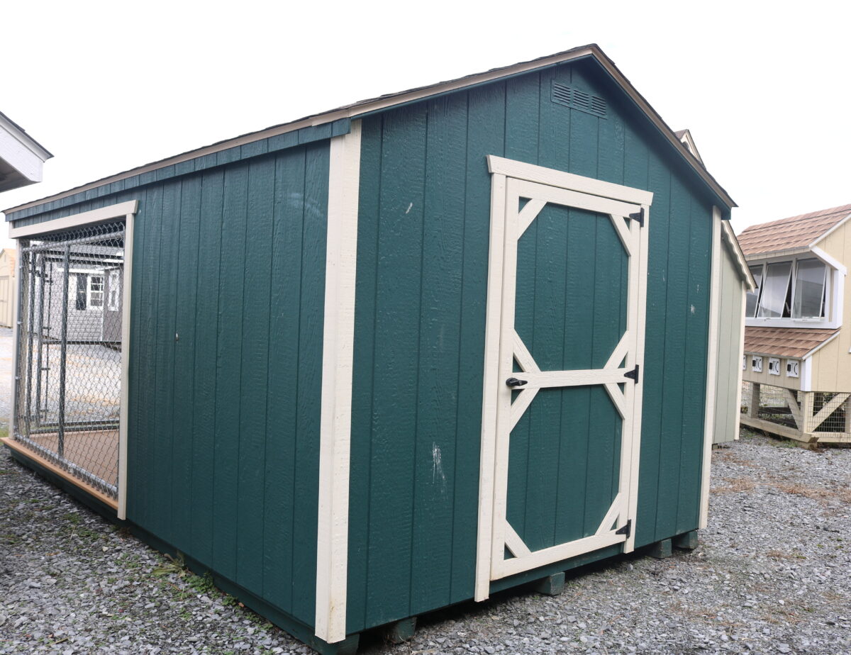 This 8×14 Double Dog Kennel is in stock and ready for delivery. With FREE LOCAL DELIVERY. Your dogs will love this home of their own. With their own little bed shelter in the back, and a grooming table on top of the bed boxes, and room for food storage as well. They will also have a nice run area to get out and enjoy the fresh air when they aren’t in their beds resting. You can also order in any color to match your house. RENT TO OWN for $367/mo. Call Milton at 301-331-9590 or E-mail me at mmiller@pinecreekstructures.com for more information.