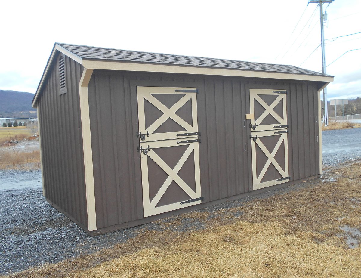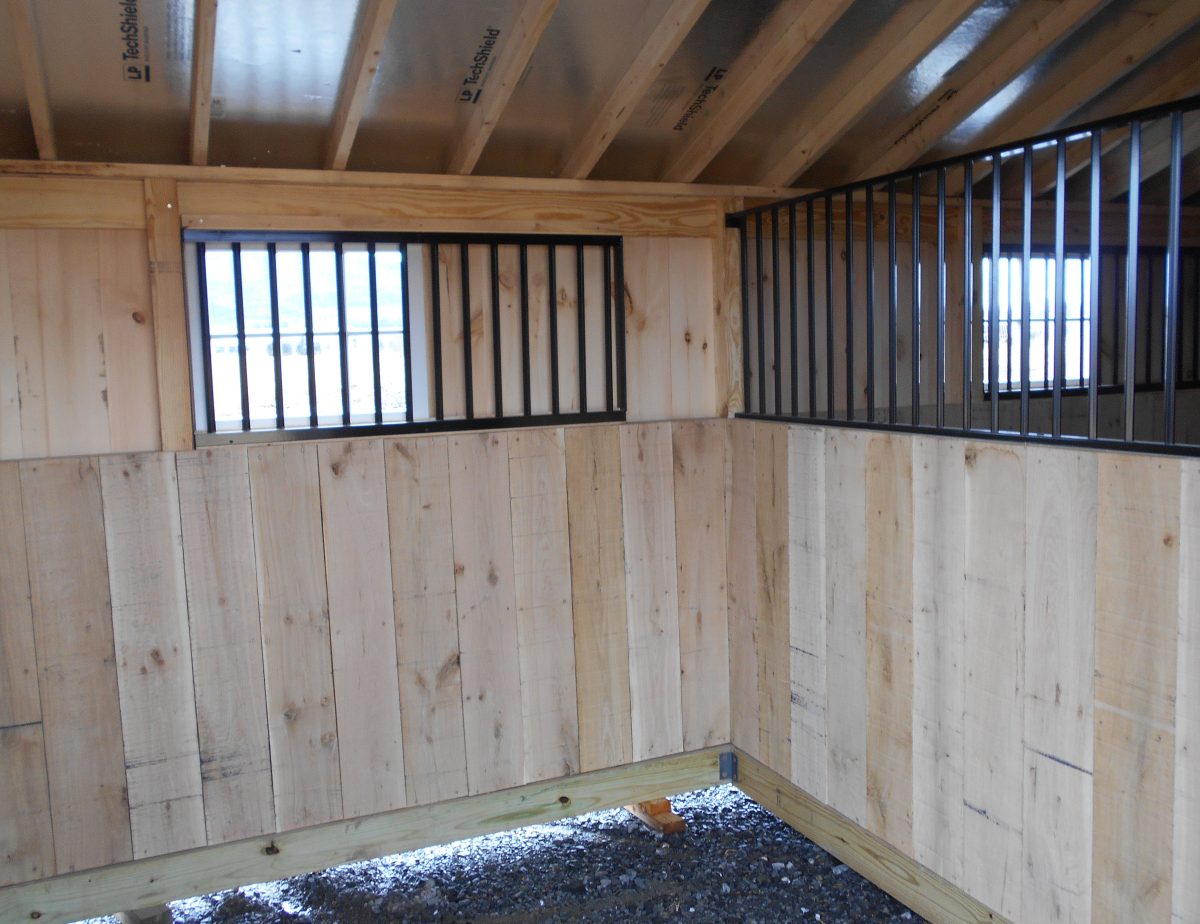 10 x 20 Horse barn with a quaker style roof 1 door and 1 window in each stall powder coated steel grills on partitions 4′ high oak kickboard white pine board and batten rustic cedar 30 year architectural shingled roof on rustic cedar color change on crossbucks gable vent 19×28 overall screened vented area don’t miss out on this nice horse barn.