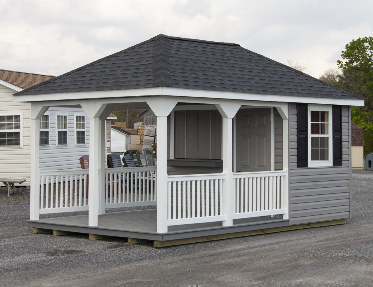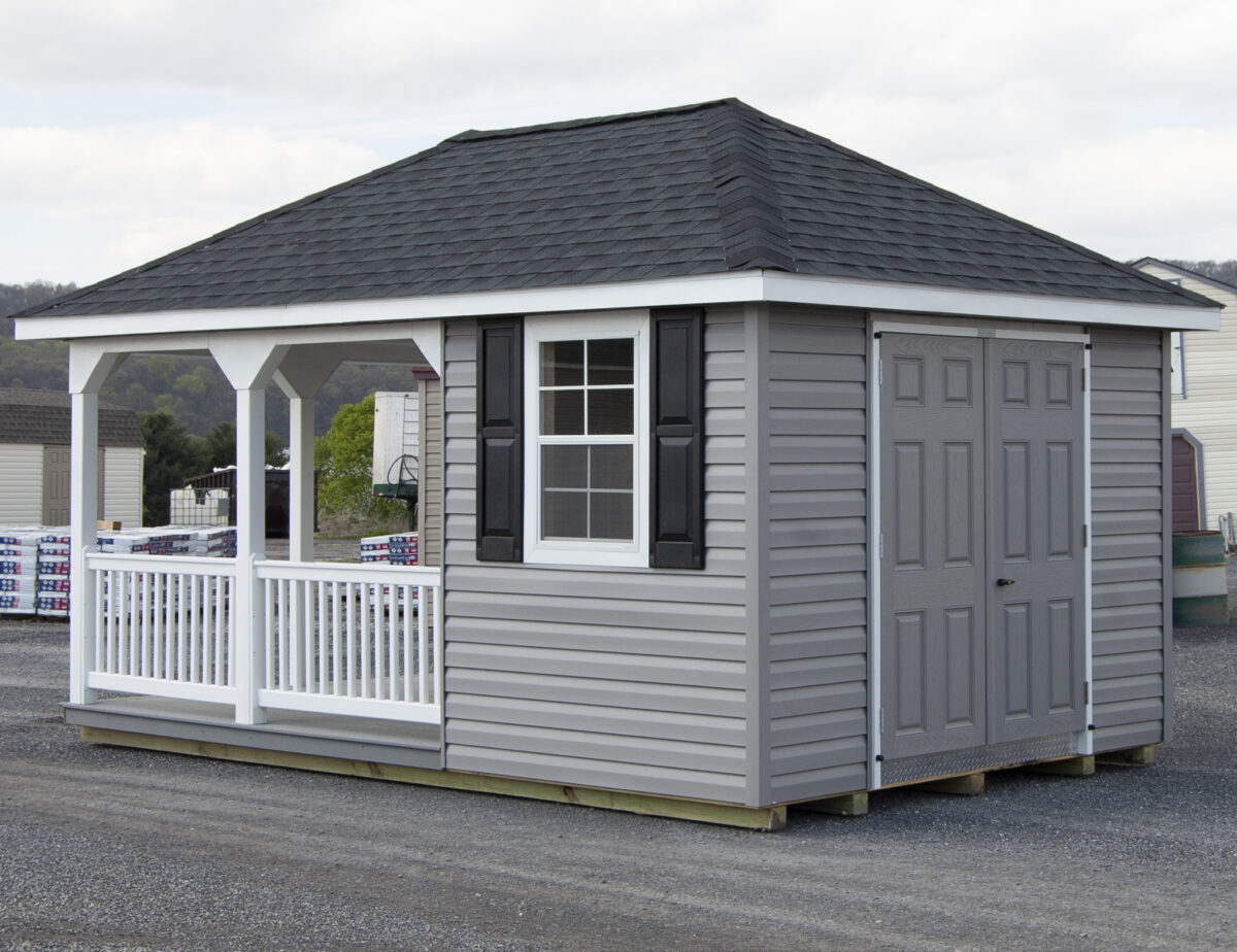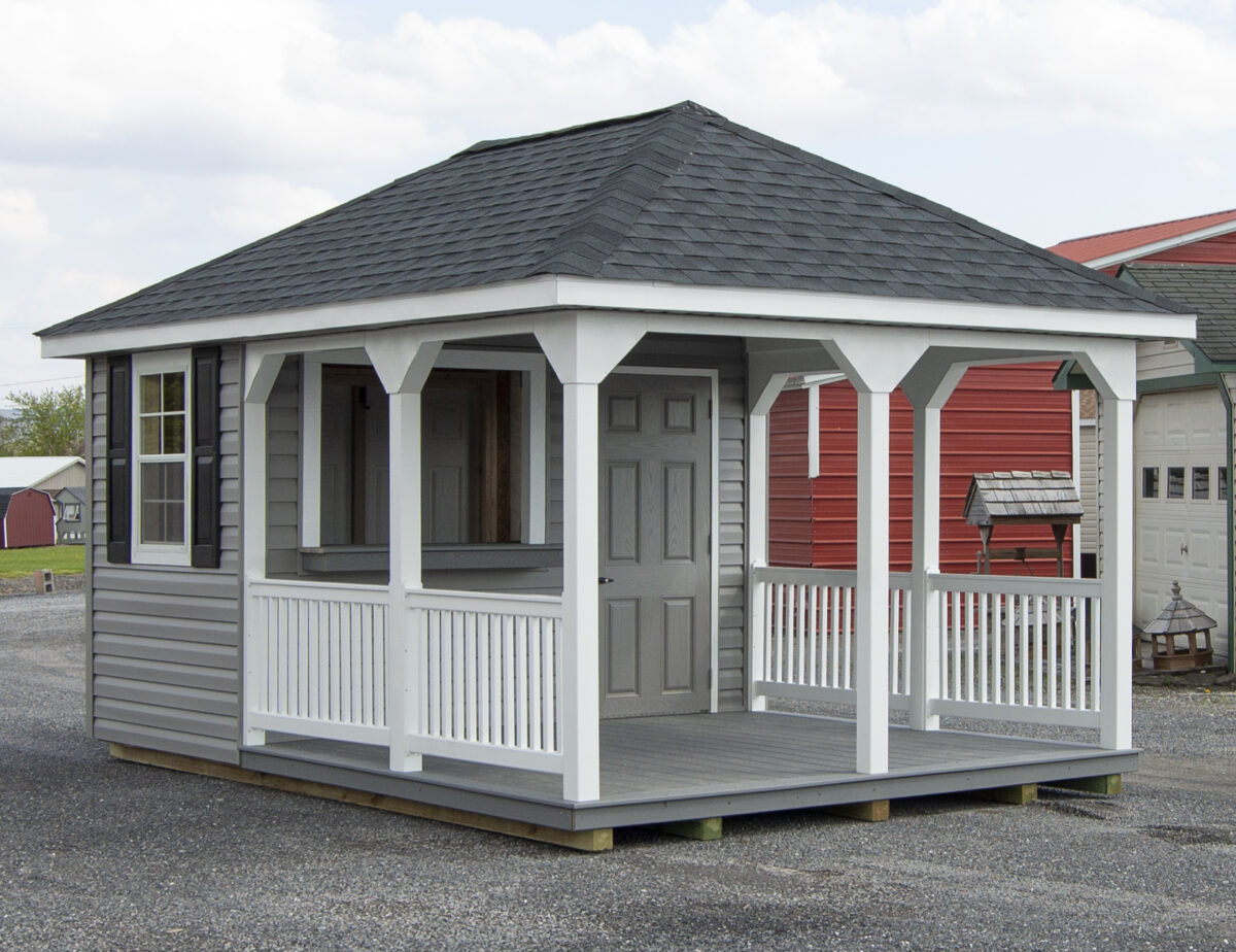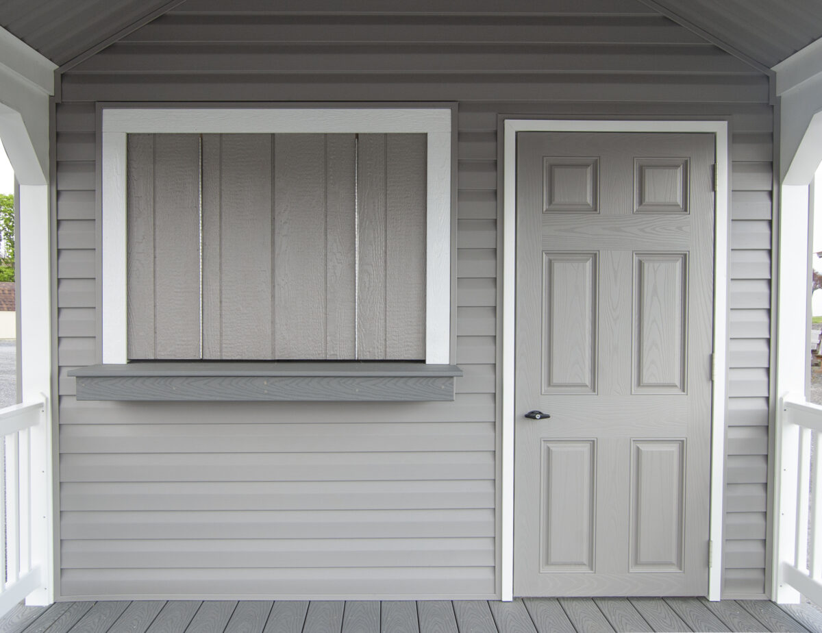 This unique building is way more than your average shed! It’s a beautiful structure that can turn any backyard into a unique entertaining space. Or place it by the pool and create a place to relax out of the sun! It features a porch with composite decking and vinyl railing. It also includes a storage area perfect for pool toys, towels, etc. It even has a serving window opening and counter for setting up snacks and drinks!