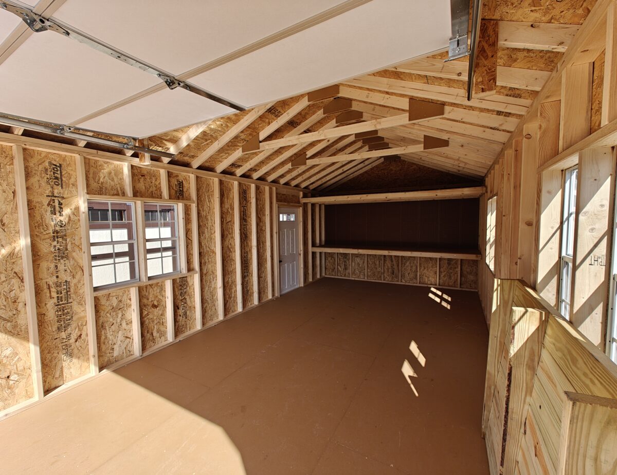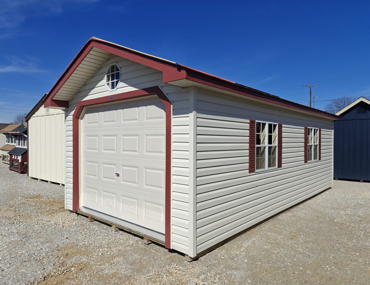 12 x 24 Vinyl Sided Peak Roof Garage just arrived at the Hanover lot. Eye Catching! Classic Sand vinyl siding with Heritage Red trim and Natural Timber architectural shingles. Thoughtfully equipped with an overhead loft, heavy duty workbench with peg board backing for handy tool arrangement, 9′ ramp, diamond plate protection at all doors, 16″ front gable overhang and 8″ vented eaves. 6 (Six) 18×36 windows and one 18″ octagon window provide abundant interior light. Well worth a visit to look it over. For additional info call Erik Waltz or Dennis at 717-646-0771. Financing available