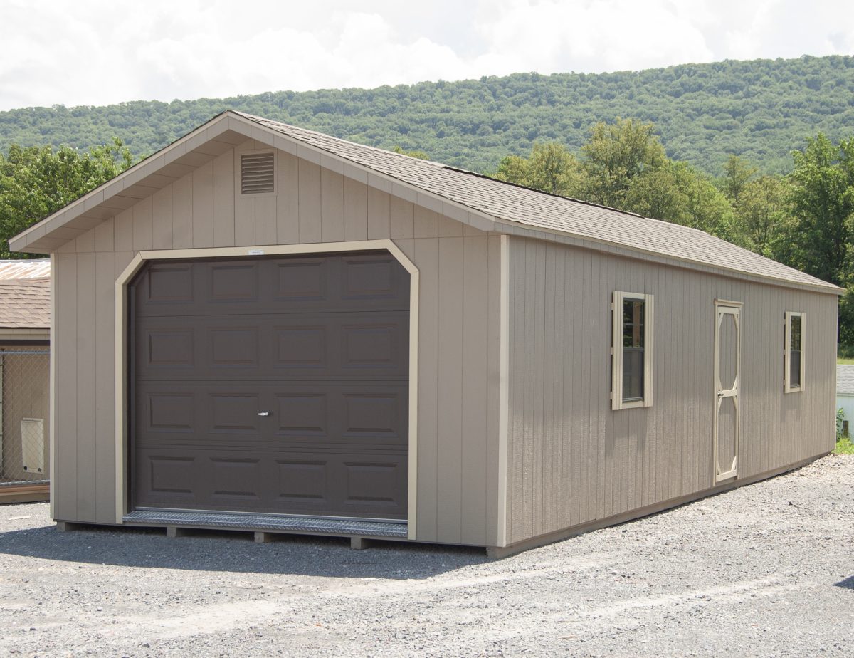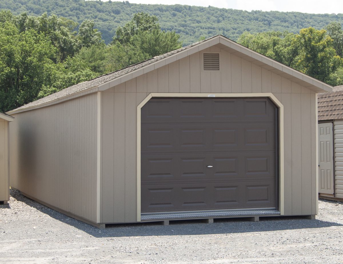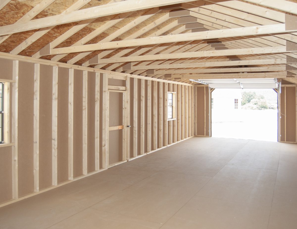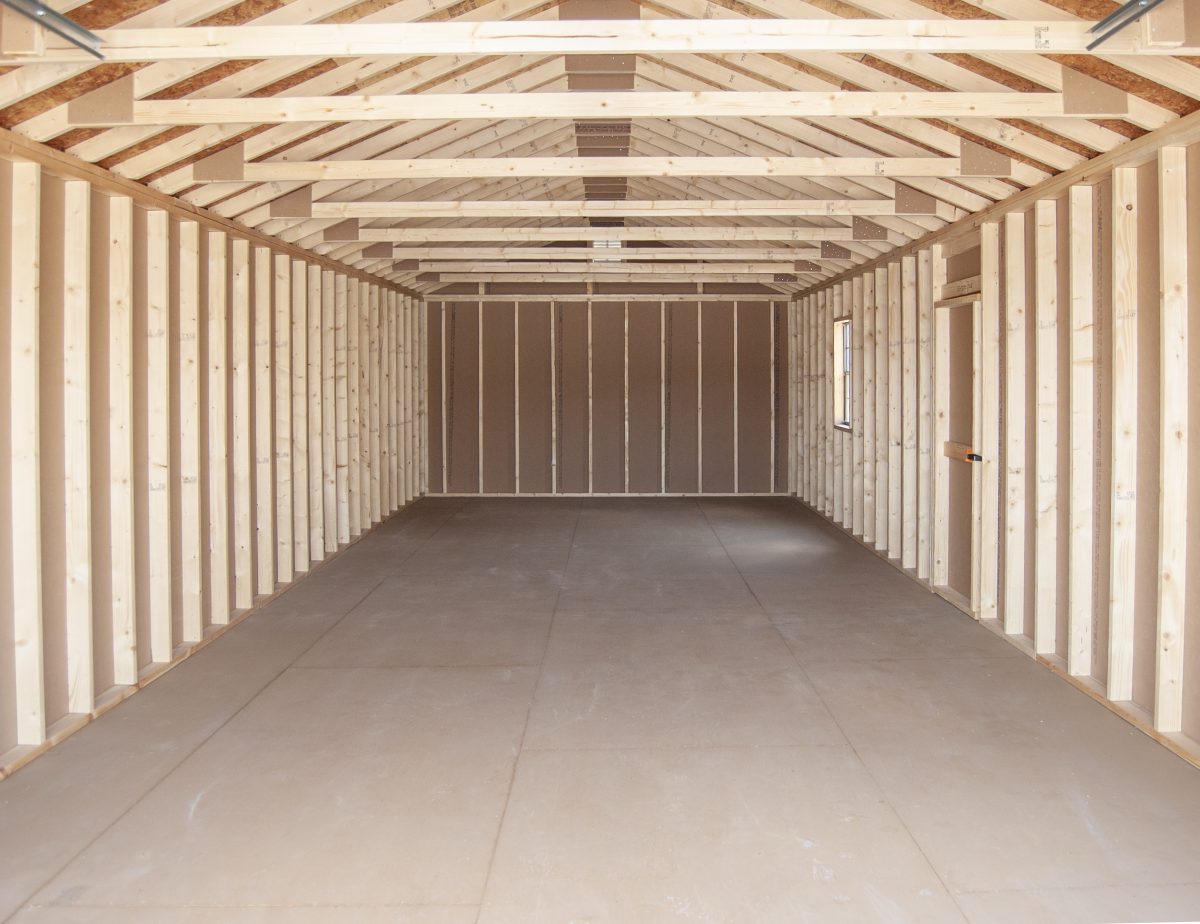At Pine Creek Structures, we specialize in storage solutions and this huge garage has room to store can store a lot! Our garages floors are built extra tough, with 12” on center 2×4 pressure-treated floor joists, a 6” solid reinforcement in the floor framing at the point of impact, a slanted 2×6 pressure treated threshold at the garage door, 3/4″ tongue and groove engineered floor, and 4×4-pressure treated runners. We added some of our most popular upgrades… a diamond tread plate at the overhead door, an extra window, gable end vents, and a shingle-over ridge vent.