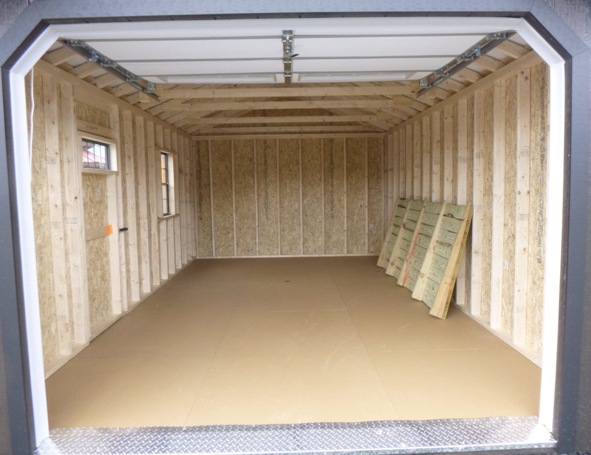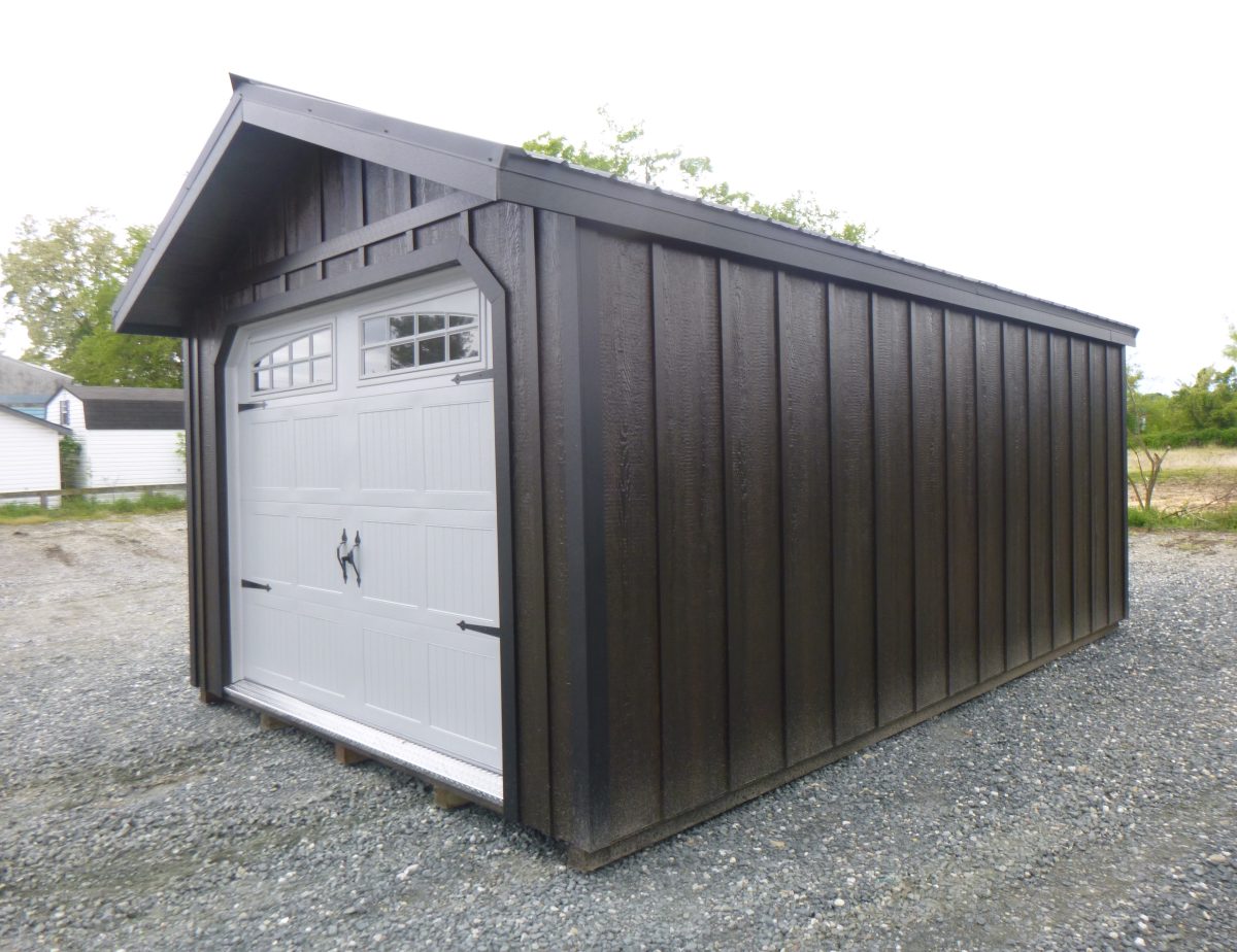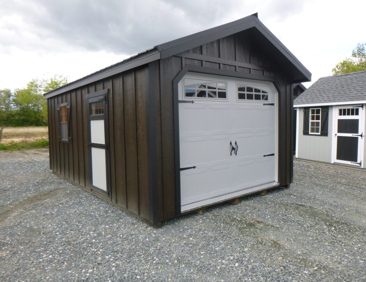 This one car garage is a great way to keep your vehicle safe and secure from the elements. This peak garage is perfect for a full size vehicle with room for extra storage or for your toys and lawn equipment. This garage features 16″ overhang above garage door, torsion springs on garage door, 3/4″ tongue and groove engineered flooring, double studded corners with interlocking top wall plates, and keyed fiberglass entry door. Both doors lock to keep your belongings safe and secure.