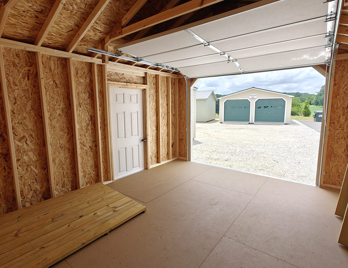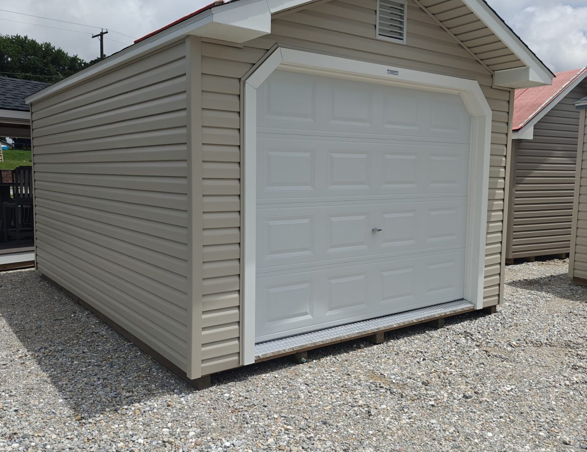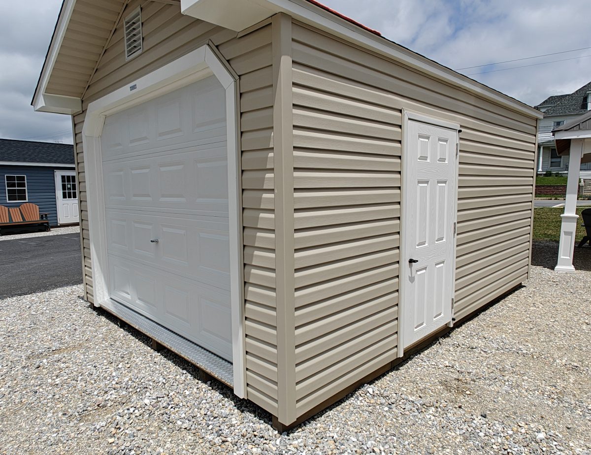 12 x 16 Vinyl Sided Peak Roof Garage just arrived at the Hanover lot! Warm Sandalwood vinyl siding with white trim and Natural Timber architectural shingles. Thoughtfully equipped with a 9′ ramp, diamond plate protection at all doors, 16″ front gable overhang. Well worth a visit to look it over. For additional info call Erik Waltz or Dennis at 717-646-0771. Financing available