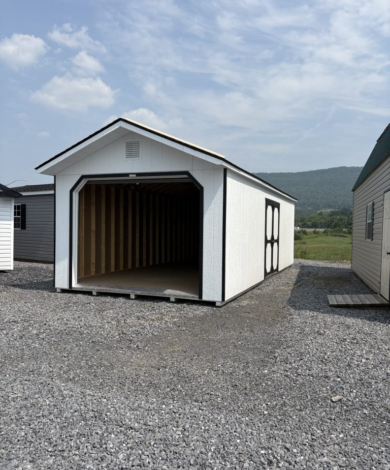 12×28 Lp smart sided peak garage features white siding and black trim also has a very nice rustic black shingled roof Very good looking building also comes with one 6×6 white door and one 9×7 garage door. Also has Gable end vents to help with air flow.