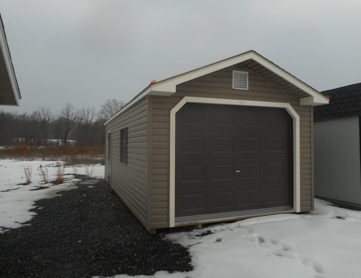 Upgrade your property with this versatile 12×24 Vinyl Peak Garage, currently available at our Limerick location. Engineered for both style and durability, this structure features a striking Java Vinyl Siding paired with Classic Sand Trim and Natural Timber Shingles, ensuring it complements your home perfectly.