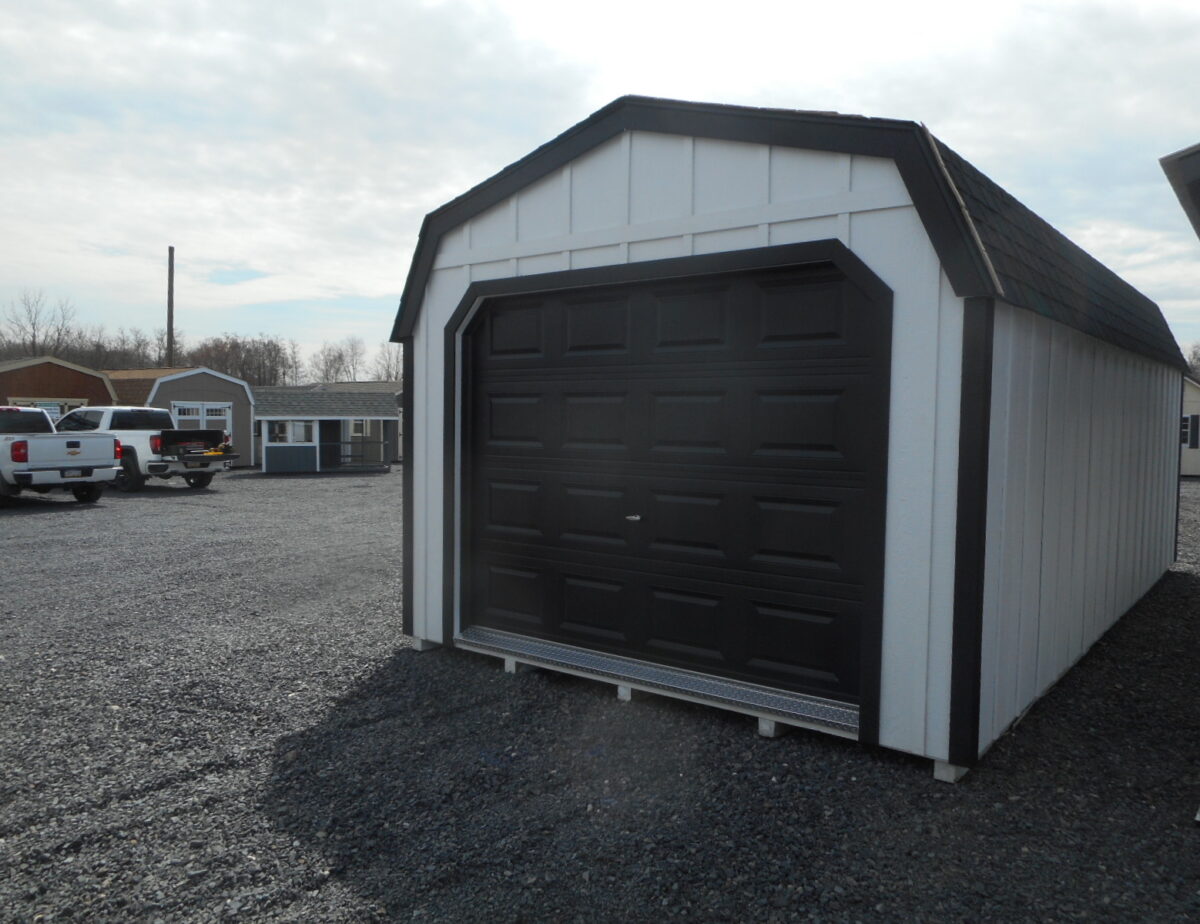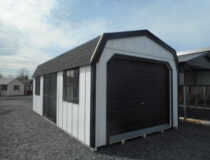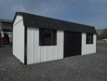 The classic Dutch roofline offers increased interior headspace, which we’ve utilized by including a 4’x12′ storage loft. Finished in a striking White LP Board-N-Batten siding with Black trim and shutters, this structure provides a sophisticated look.