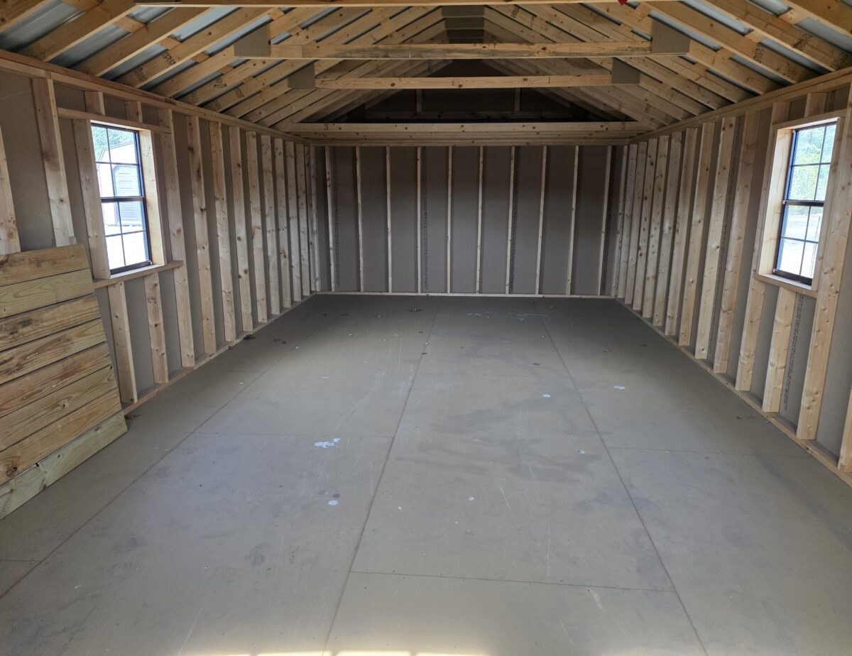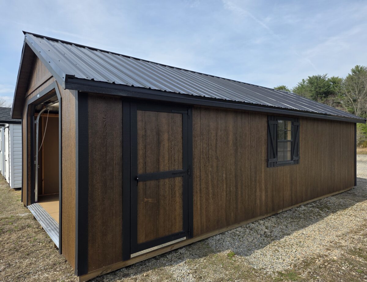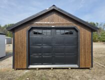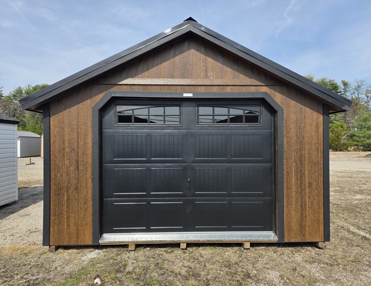 Check this beauty out. Here we have a 14×28 Cape Cod Garage with upgrades. This garage has upgraded polyurethane paint to give a it a beautiful stained look with an upgraded colonial garage door with added windows. The roof was upgraded to metal for looks and durability. Also added are diamond plate tread plates for the doors along with a ramp and loft. This garage is a stunner that will enhance your properties look and ample storage abound. Stop by today to see this garage or design one to your liking.