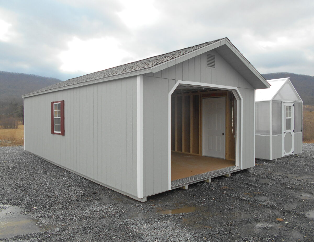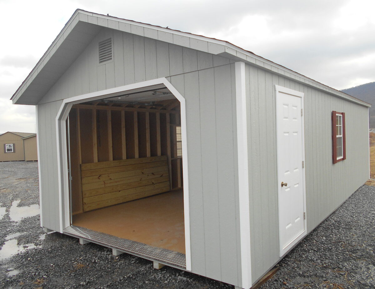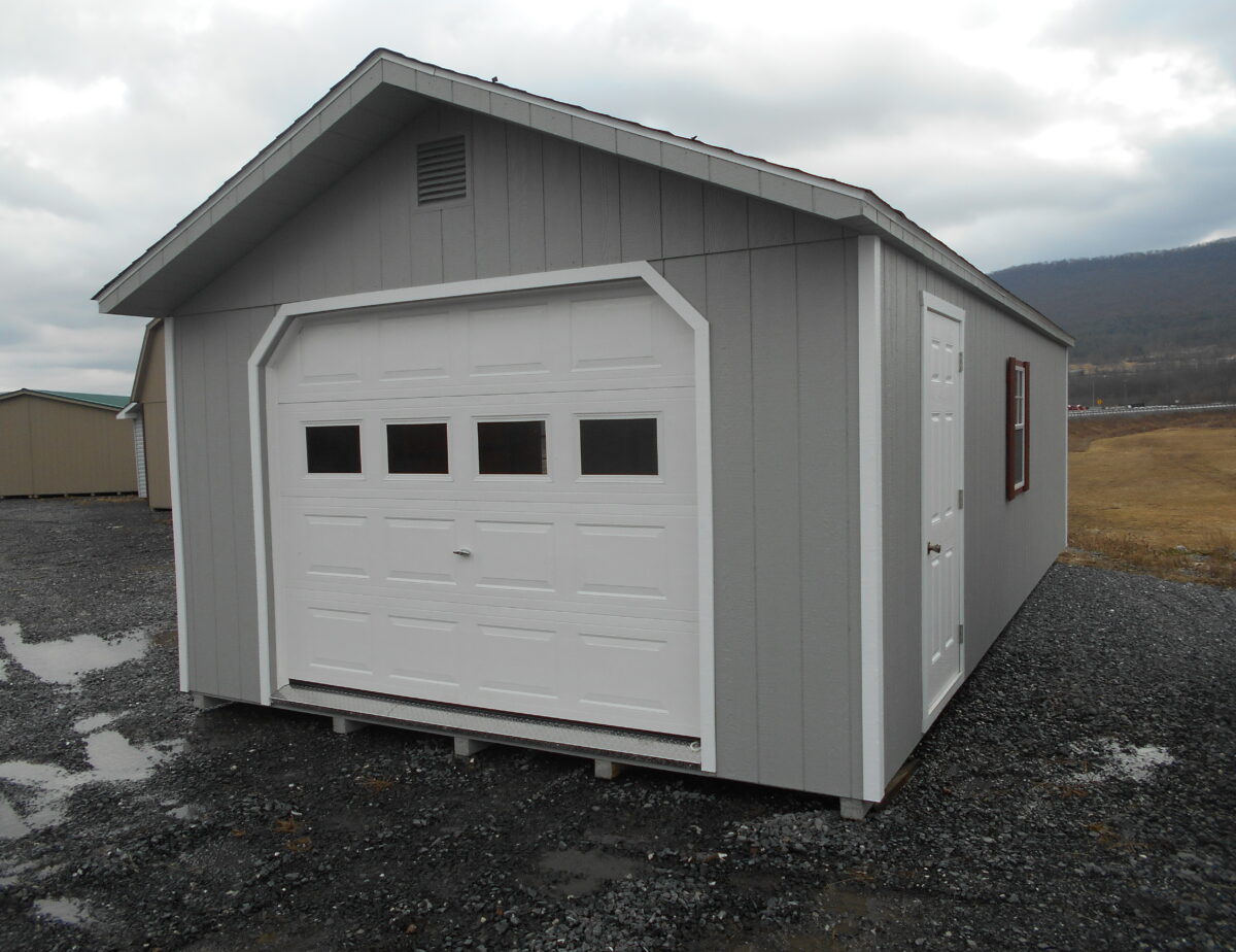 This 14×28 Light Grey siding with white Trim Peak Garage Features a 9×7 garage door, A 36 inch passage door,