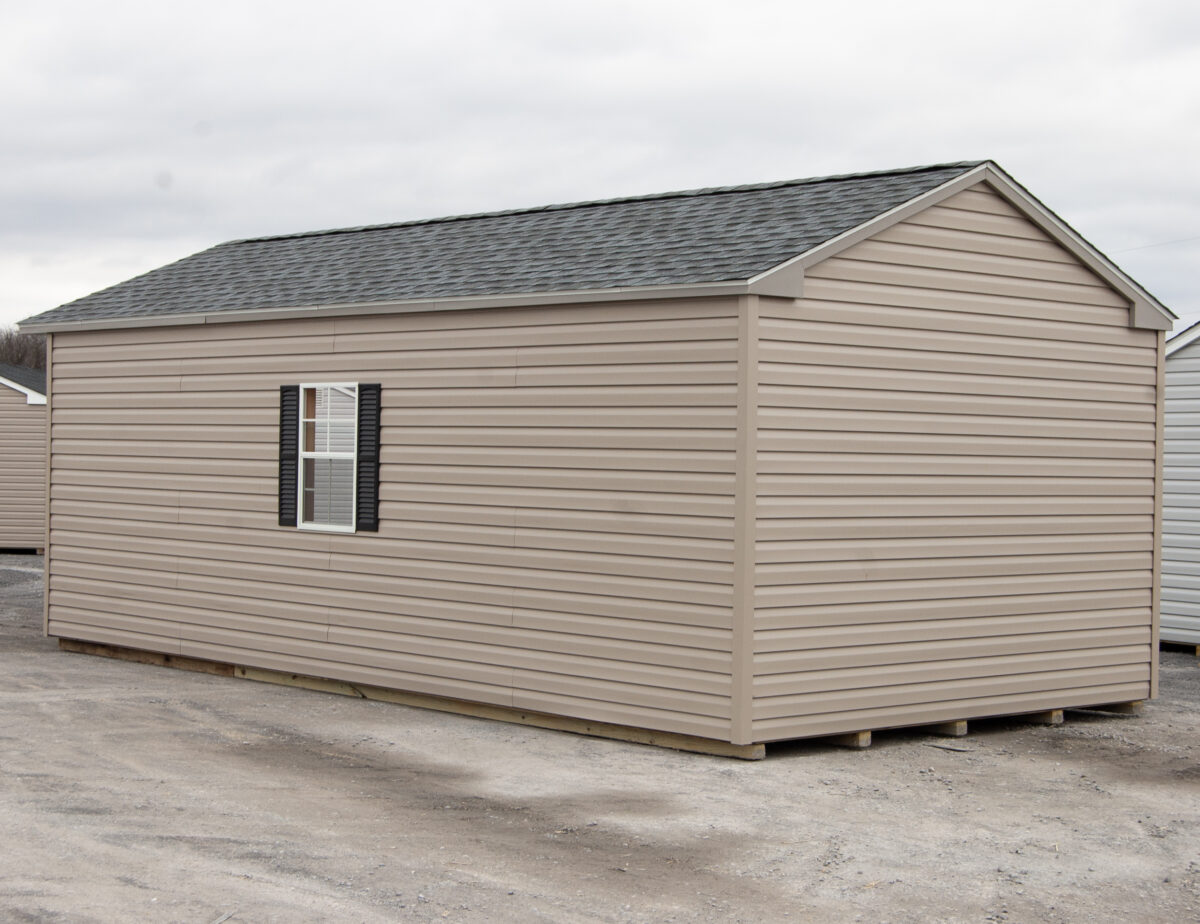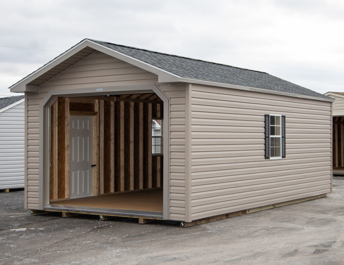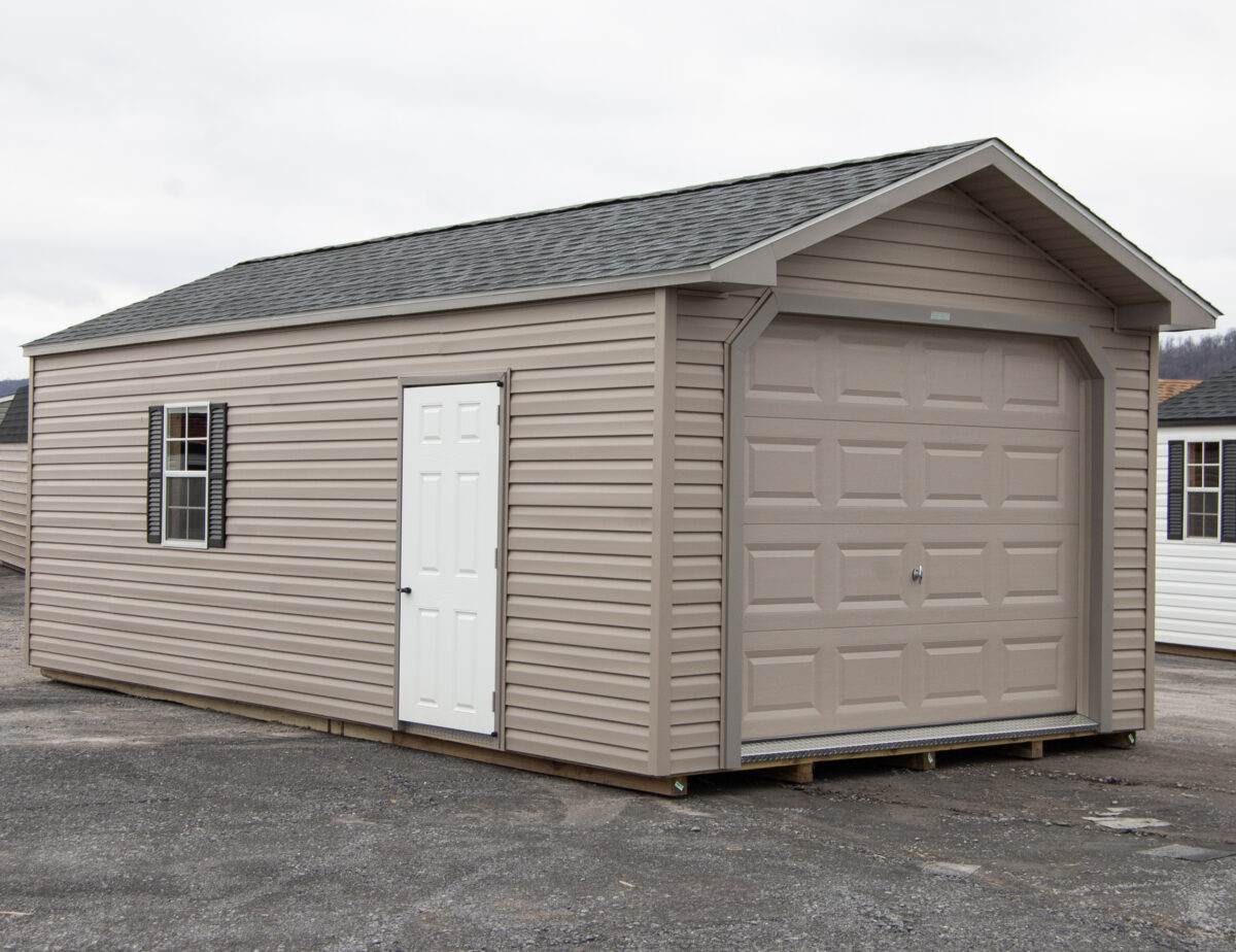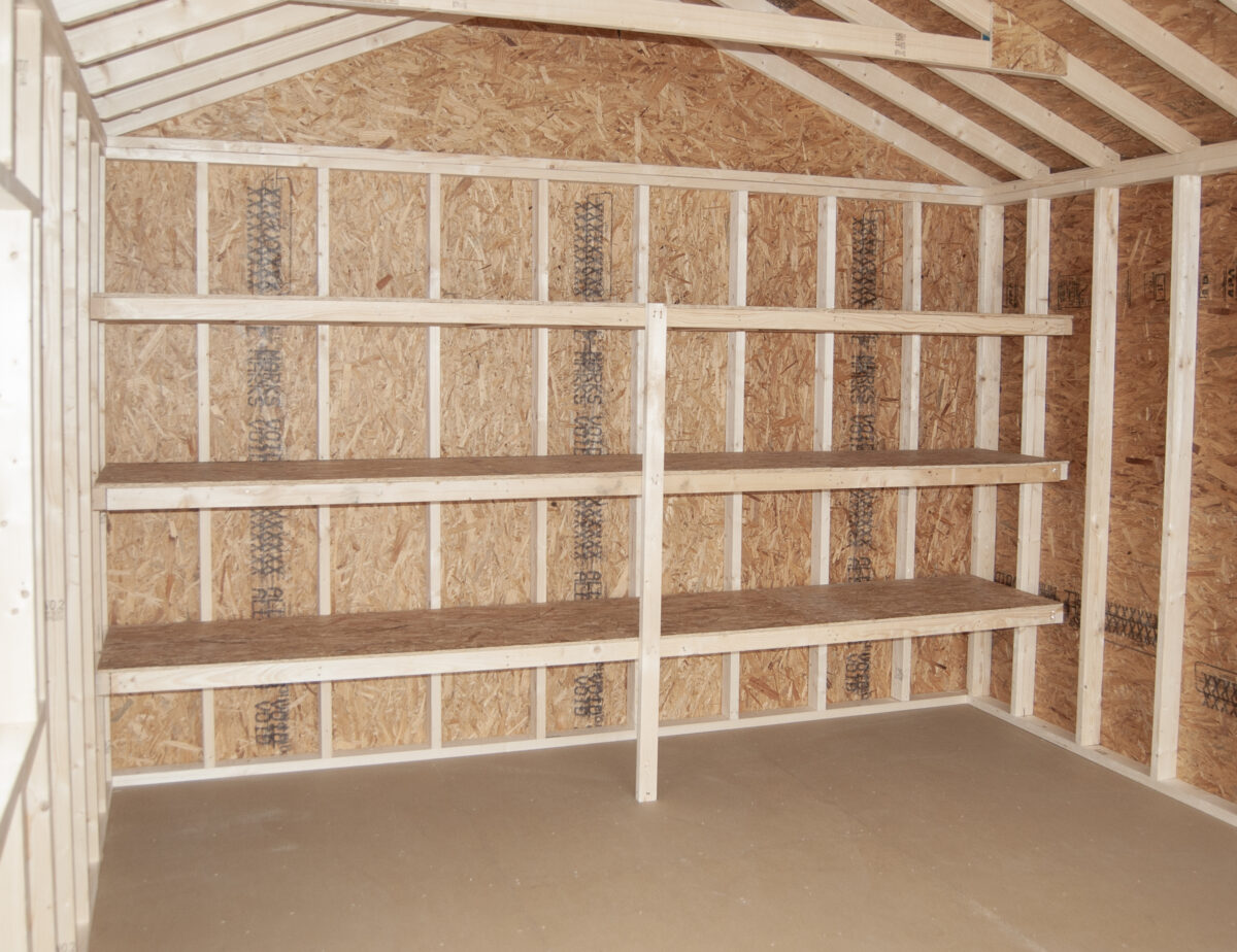 Protect your vehicle from the rain, hail, snow, dust, and dirt inside this beautiful Peak Garage! This garage features 16″ overhang above garage door, torsion springs on garage door, 3/4″ tongue and groove engineered floor on pressure treated 2x4s (12″ on center), double studded corners and top wall plates, and keyed fiberglass entry door. We also added an additional window, a ridge vent, and built-in shelves inside across the back.