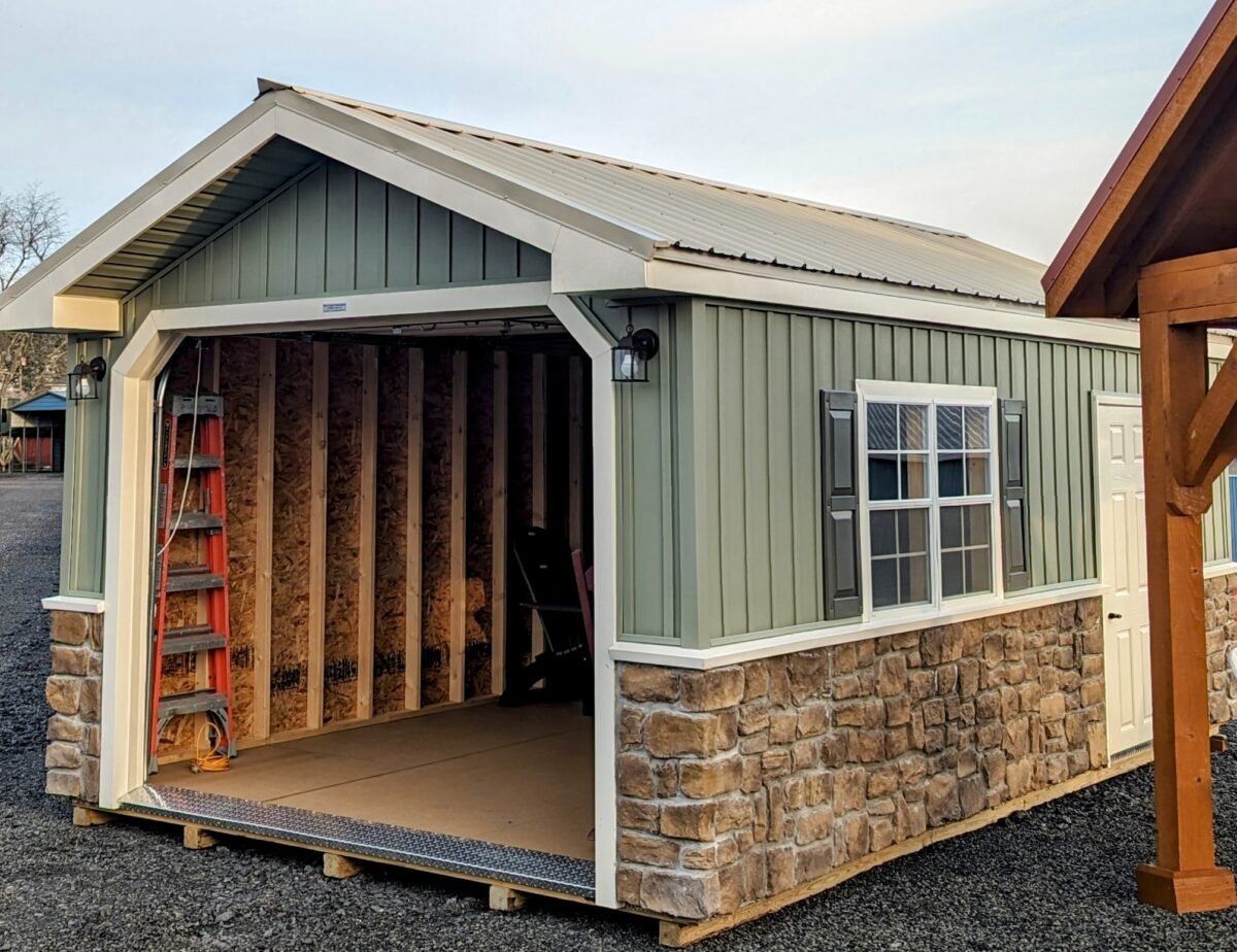 We dressed up this 12×20 garage with hand laid stone, board and batten vinyl siding, and some basic electrical. It also features 16″ overhang above garage door, torsion springs on our garage doors, 3/4″ tongue and groove engineered floor on pressure treated 2x4s at 12″ on center, double studded corners and top wall plates, and a keyed fiberglass entry door.