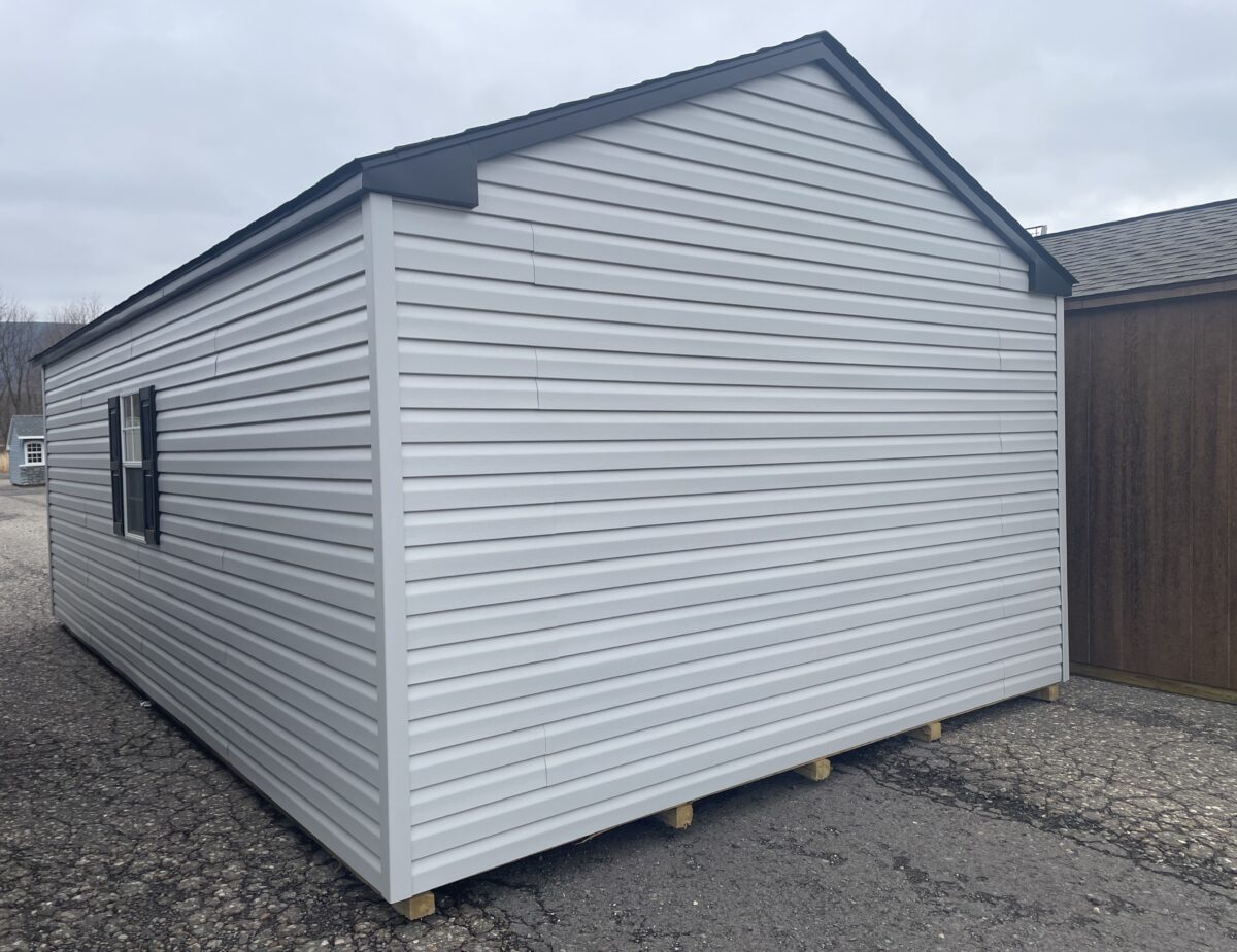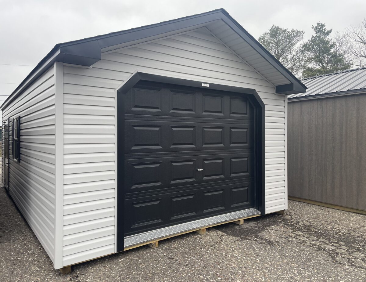 This Amish built  maintenance-free vinyl sided 14×24 Peak Garage is in stock and ready for delivery.  This is the perfect garage if you want a place to keep your car out of the weather, and also have room for regular storage. It is big enough to have plenty of room with out having to worry about things falling into your car. Come check it out today. Have this building delivered in a week or order one to suit your needs and have it in 2-3 weeks at no extra cost.  A ramp is included for easier access.