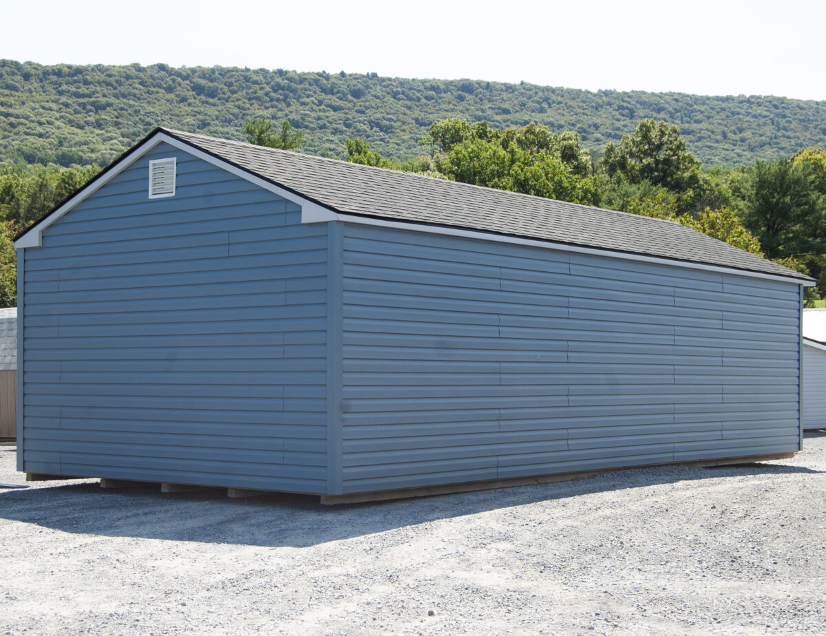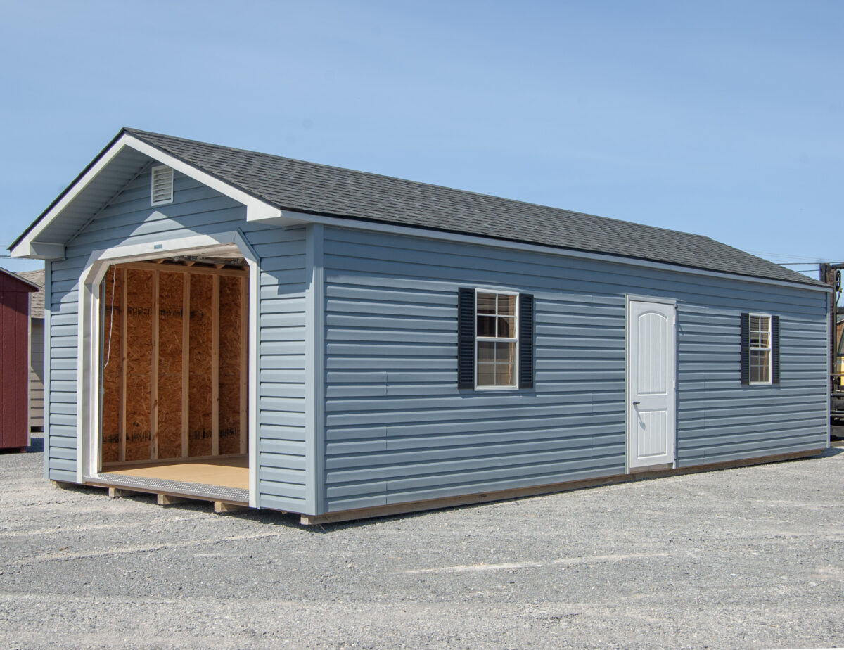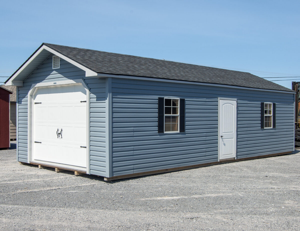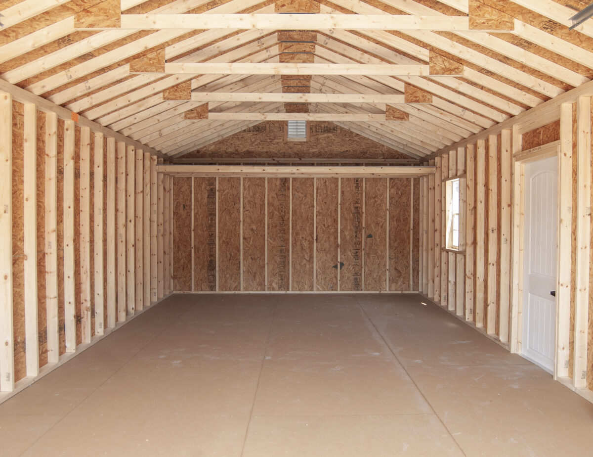 This one car garage is a great way to keep your vehicle safe and secure from the elements. This garage features torsion springs on garage door, 3/4″ tongue and groove engineered floor on pressure treated 2x4s (12″ on center), double studded corners, interlocking top wall plates, 4×4 pressure treated runners, a 6” solid reinforcement in the floor framing at the point of impact, a slanted 2×6 pressure treated threshold at the garage door, and keyed locks on both the single entry door and the garage door. We even added a loft inside to increase your storage space!