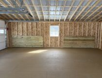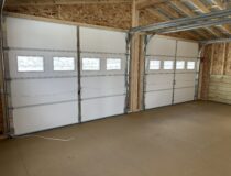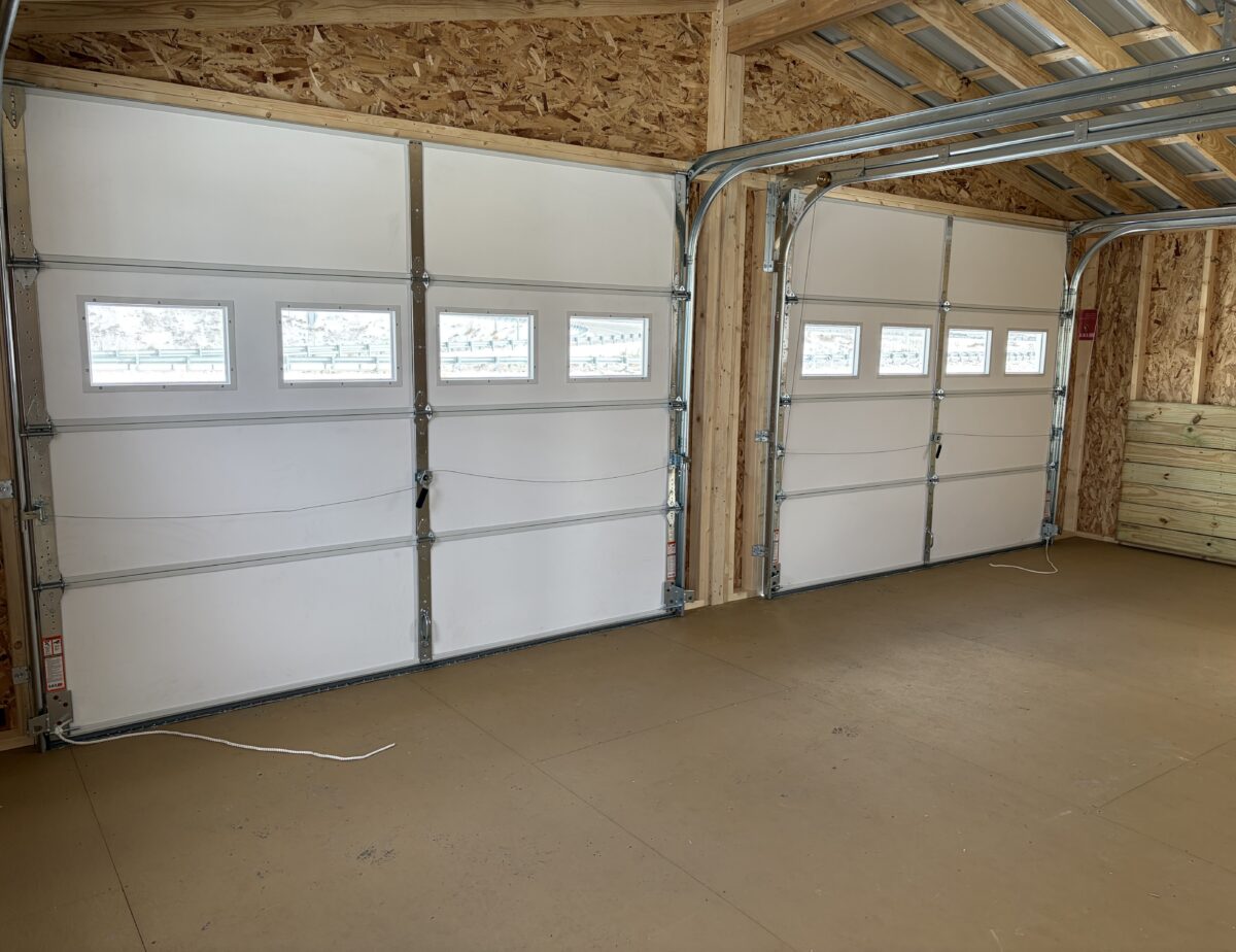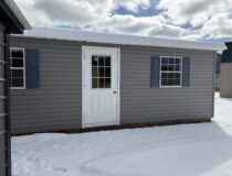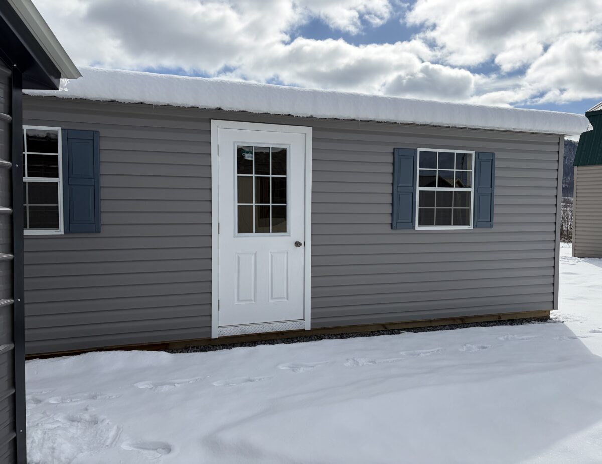 24×26 Vinyl Graphite grey with white trim and a black steel roof. Two car garage features one 36×80 White 9L House Door And three 30×36 White Slider Windows, two 9×7 Garage doors with windows, 6 inch overhang All Around, with blue shutters also comes with a 24′ Ridge vent and a 9′ Ramp, Two 9′ Diamond Plates. This style building could also be deigned to use for a camp or a weekend get away ! Lots of oprions !!!
