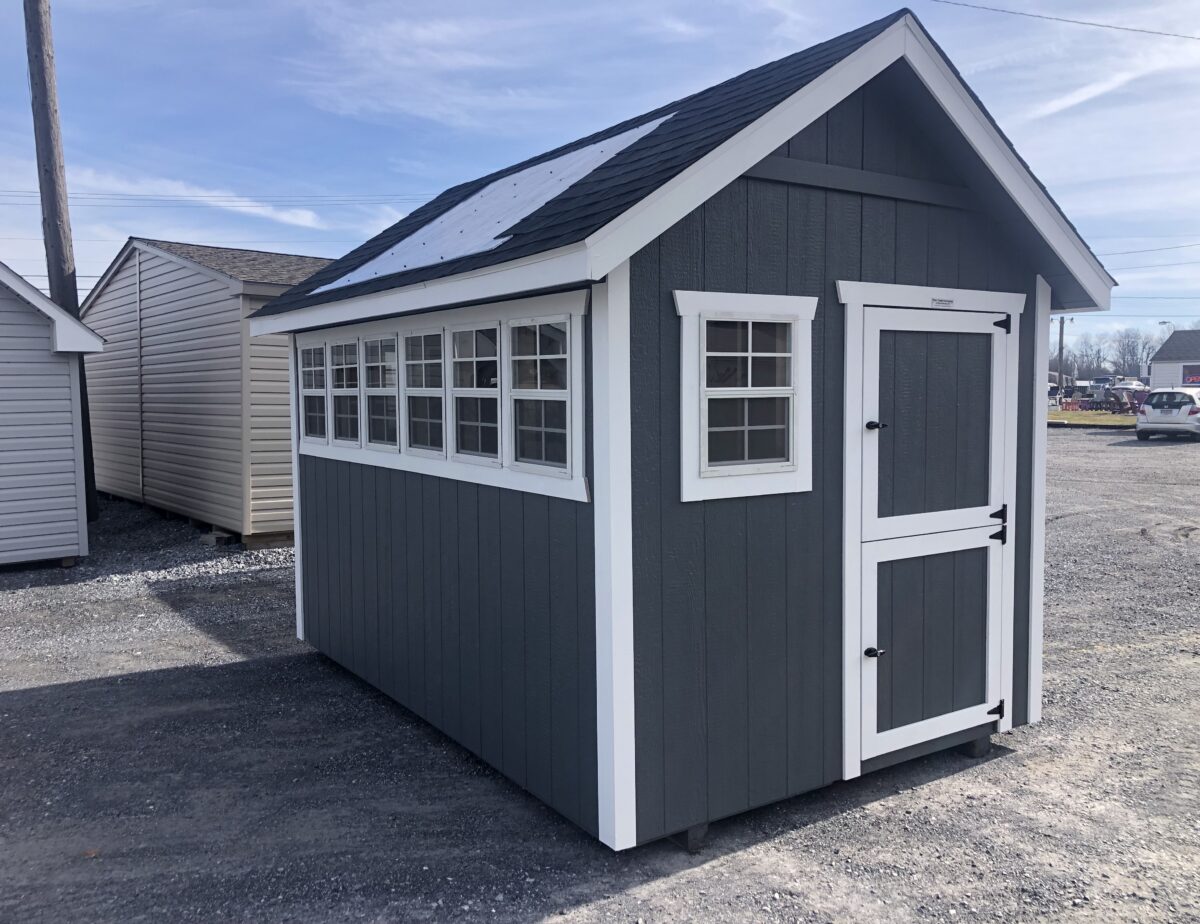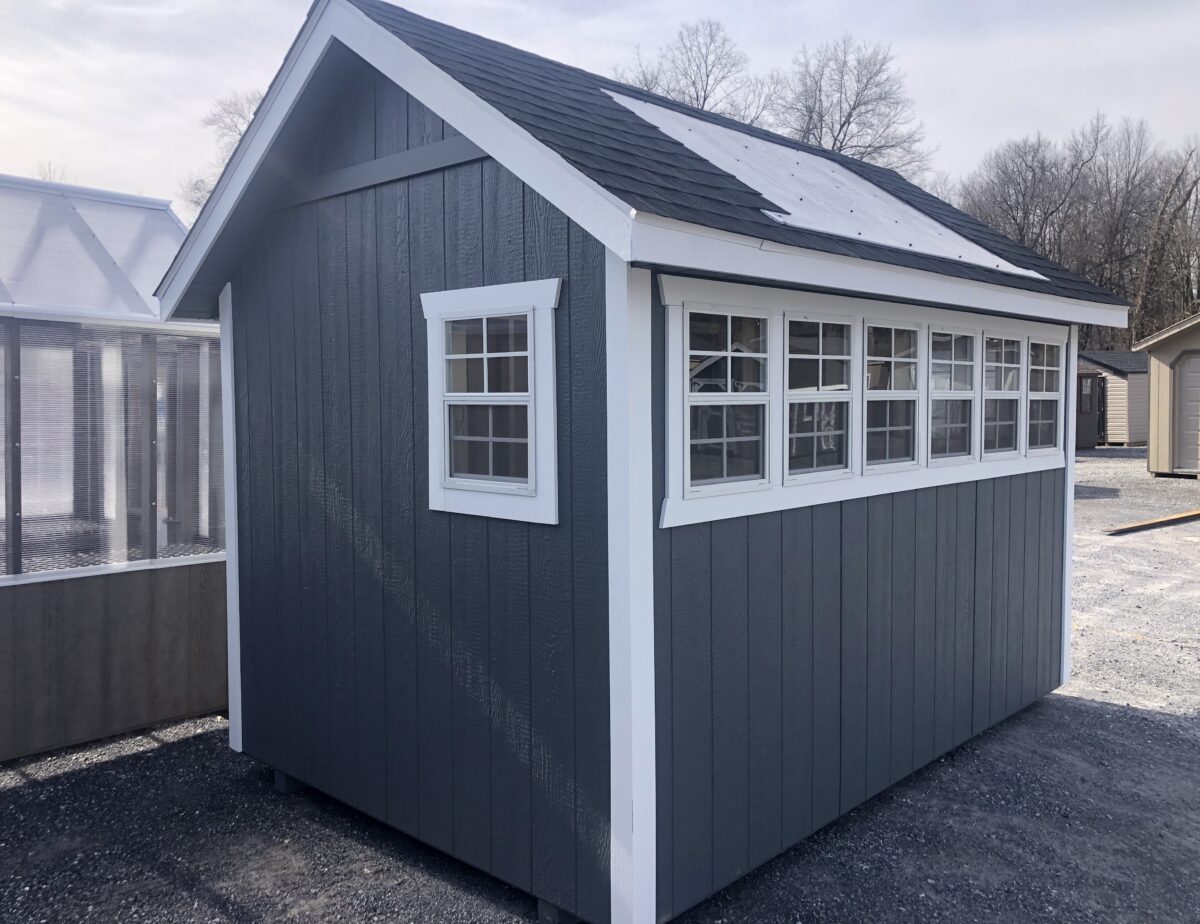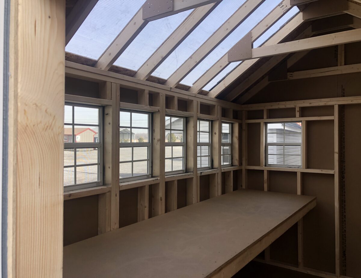 For more information call 717-361-8986 or etown@pinecreekstructures.com cell 717-629-9544 This potting shed comes with sky light in roof, 8″ roof overhangs, 18″x23″ windows the length of the building and 2 extra windows on gable, 36″ Dutch door, 3′ work bench length of building.
