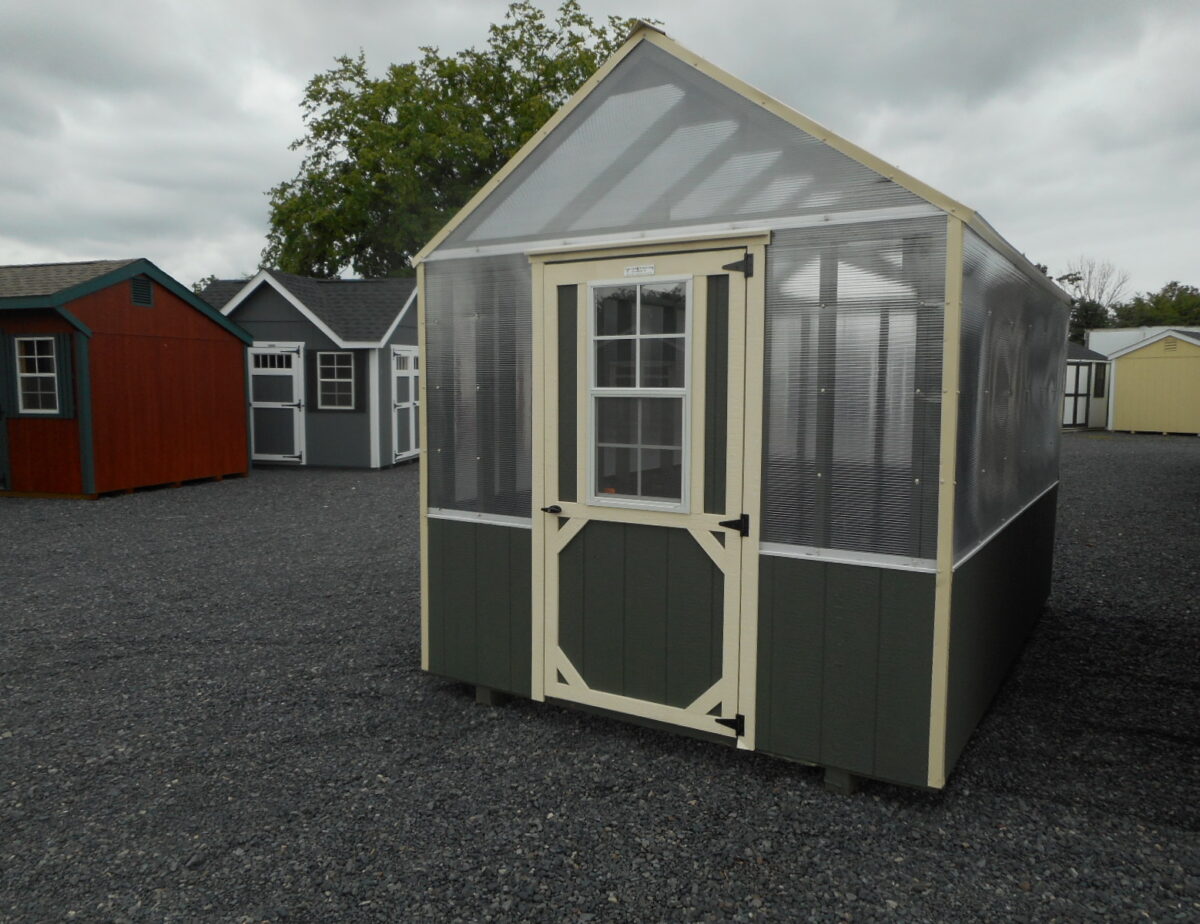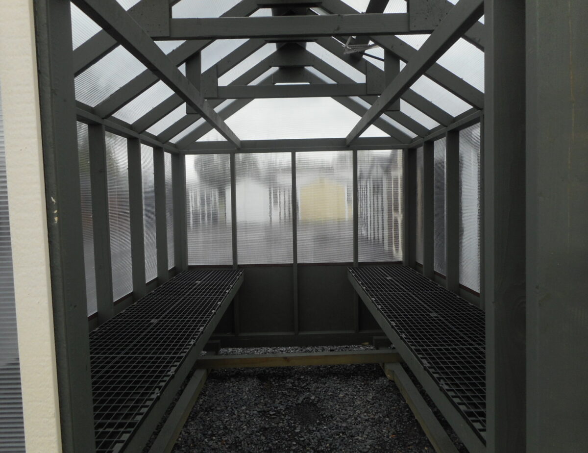 We’ve been listening and are happy to now provide a beautiful greenhouse structure for our customers! Choose from one of two standard sizes: 8′ x 12′ or 6′ x 8′. Our greenhouses feature solid construction including 2×4 framework with 8mm clear twin wall polycarbonate on roof and upper walls and LP Smart Side on lower walls. The shelves inside offer plenty of space for plants and over each shelf is a 2×4 for hanging baskets. The greenhouse door features a large window that can be opened for air to circulate. Electrical and venting options are also available.