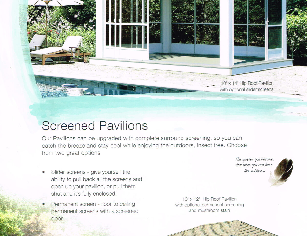 All pavilions have the option for Savannah Posts, (which are shown in the one we have on display) or with stone pillars. Those that are ordered with a floor have the option for sliding screens as well as fixed screens.