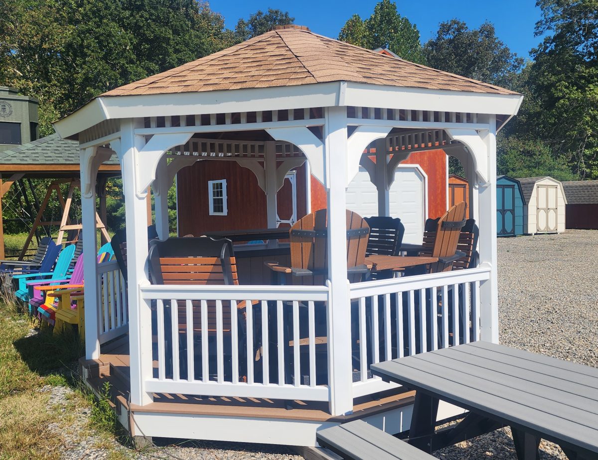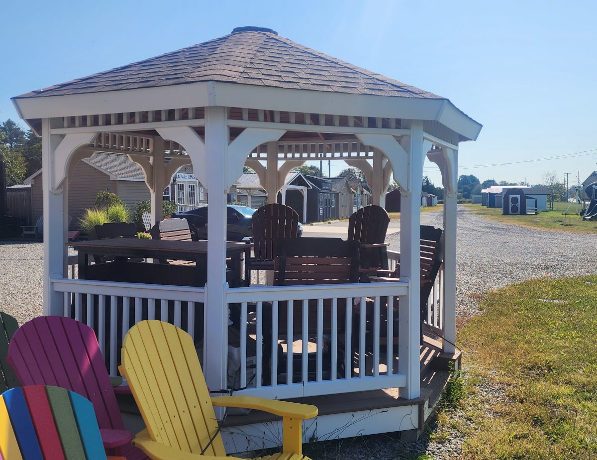 Looking to dress up your back yard and add seating that offers shade and cover from the elements. Look no further here is a 12′ vinyl gazebo to do just that. Available in many sizes, shapes, and colors. Stop by today to find your perfect backyard upgrade.
