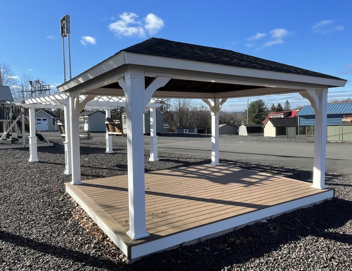 Come check out this beautiful handcrafted Amish build Pavilion. The posts are pressure treated 6″x6″ sleeved in low maintenance high quality vinyl. The rafters are 2″x4″ at 24″ centers topped with a 1″x8″ white pine tongue and groove bead board.