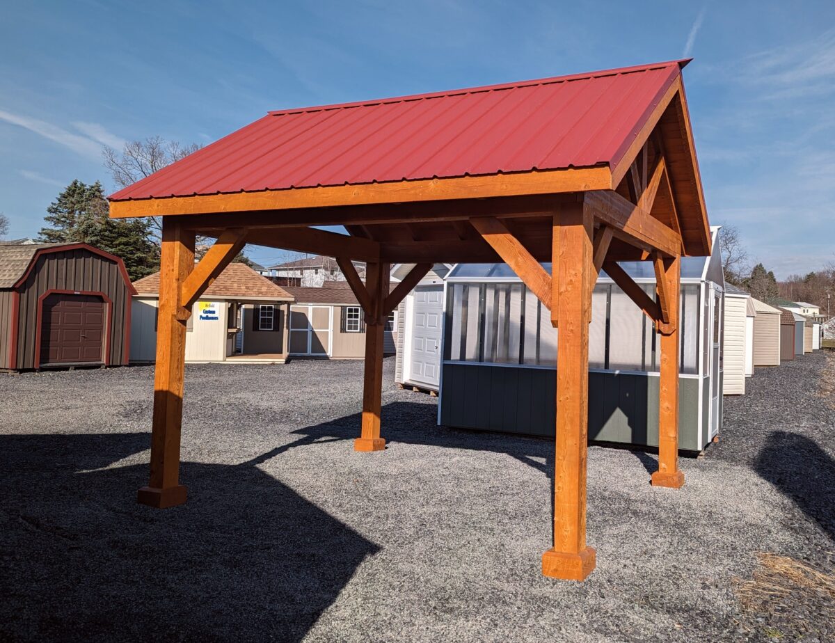 The 10×12 Rough-Cut Hemlock Pavilion offers a strong, rustic, and attractive outdoor structure for your yard or patio. It is crafted from kiln-dried, rough-cut hemlock, which gives the frame a bold and natural appearance. Because hemlock has a dense grain, the pavilion stands solid through changing seasons and delivers long-lasting beauty. The Natural Stain enhances the texture of the wood, while the Rural Red textured metal roof adds contrast and charm.