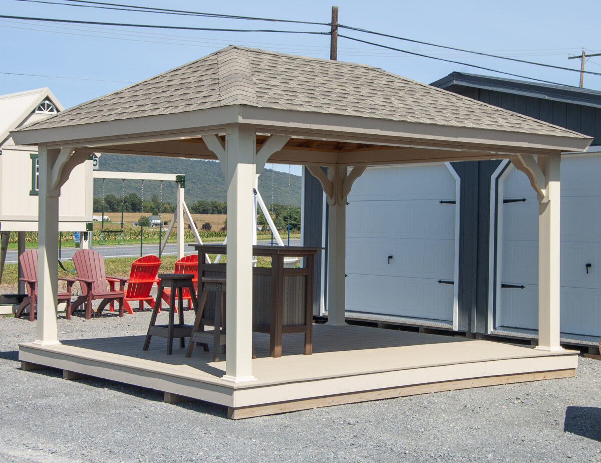 This vinyl pavilion can turn a patch of boring backyard into a gathering space with ease! Add patio furniture to create an outdoor seating area to enjoy a meal, relax with your morning coffee, or share drinks with friends. This pavilion features a hip style shingle roof, vinyl sleeved posts, and composite decking. Come see it in person at Pine Creek Structures of Spring Glen (Hegins), PA. Call (570) 682-9625 for more info.