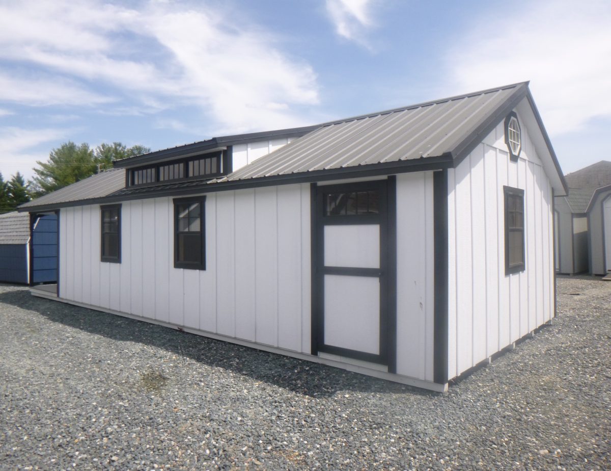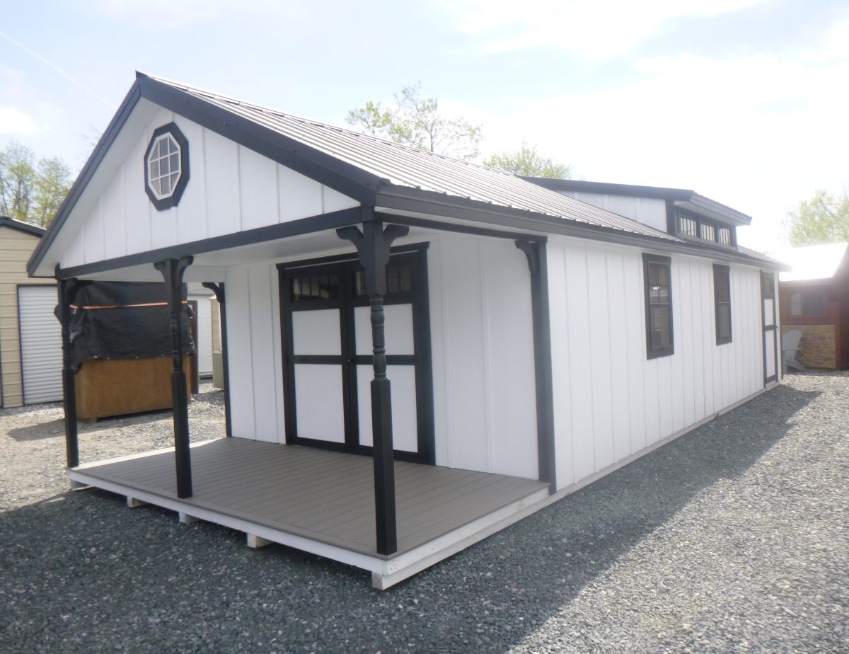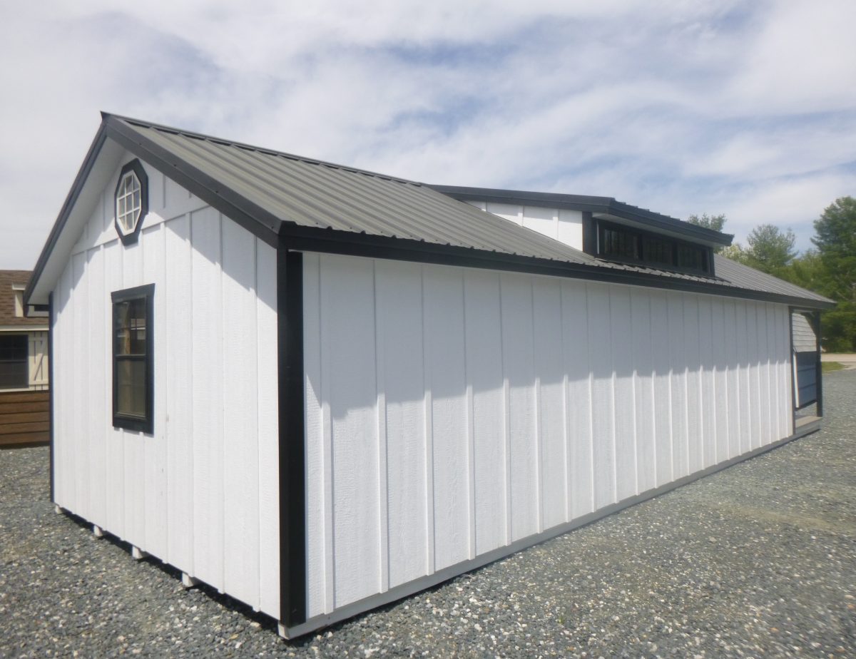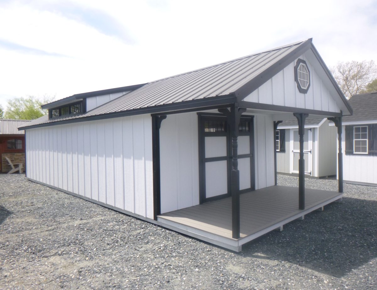 Let this one of a kind 14 x 36 Cape Cod storage building/workshop with Black Textured metal roof, 8″ overhangs all around and attractive board & batten exterior look Un-clog your basement or garage with this eye-catching Spacious (420 sq ft) interior and (84 sq ft) front porch provides loads of room for lawn equipment, snow blowers, bicycles, motorcycles, kids toys or just general storage with plenty of room left over for workshop projects. Also includes 2 overhead loft above a sturdy 3 x12 workbench with secured shelved storage underneath. The Double 112″ dormers and Diamond windows in Gables easily lights the inside no matter the time of day. Easy access with 6×6 double doors with ramp and an extra 36″ access door. Also plenty of light with 3 vertical sash windows with screens and additional wall and door transom windows.