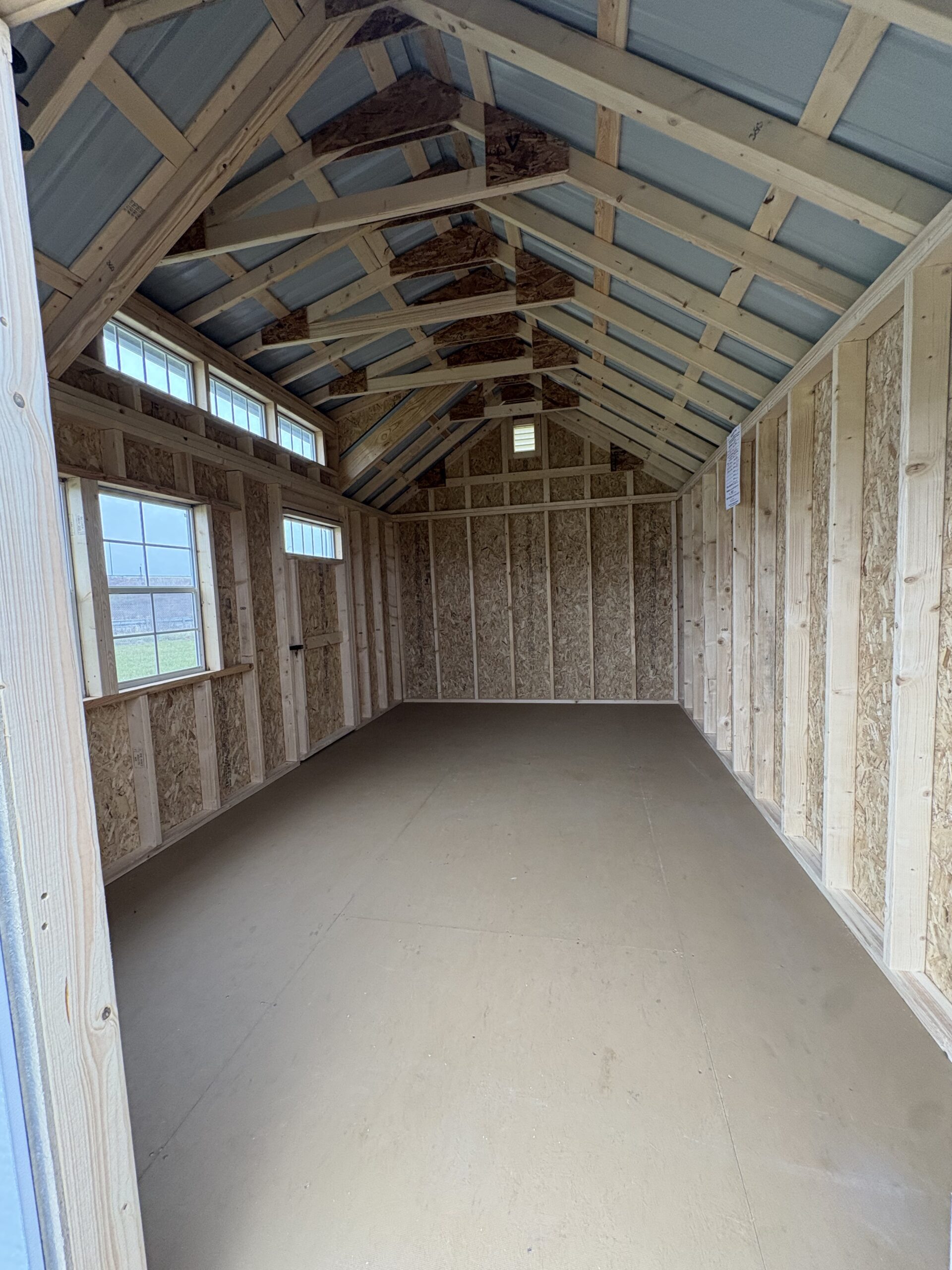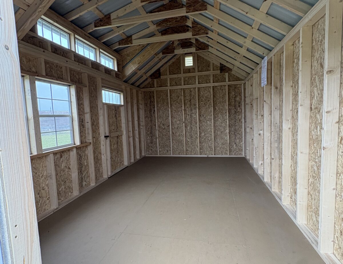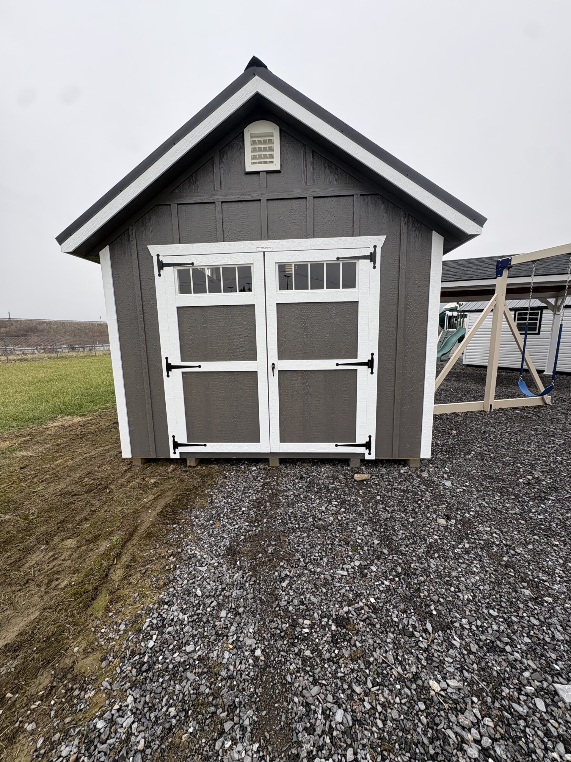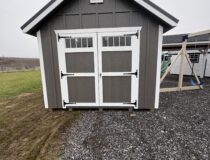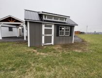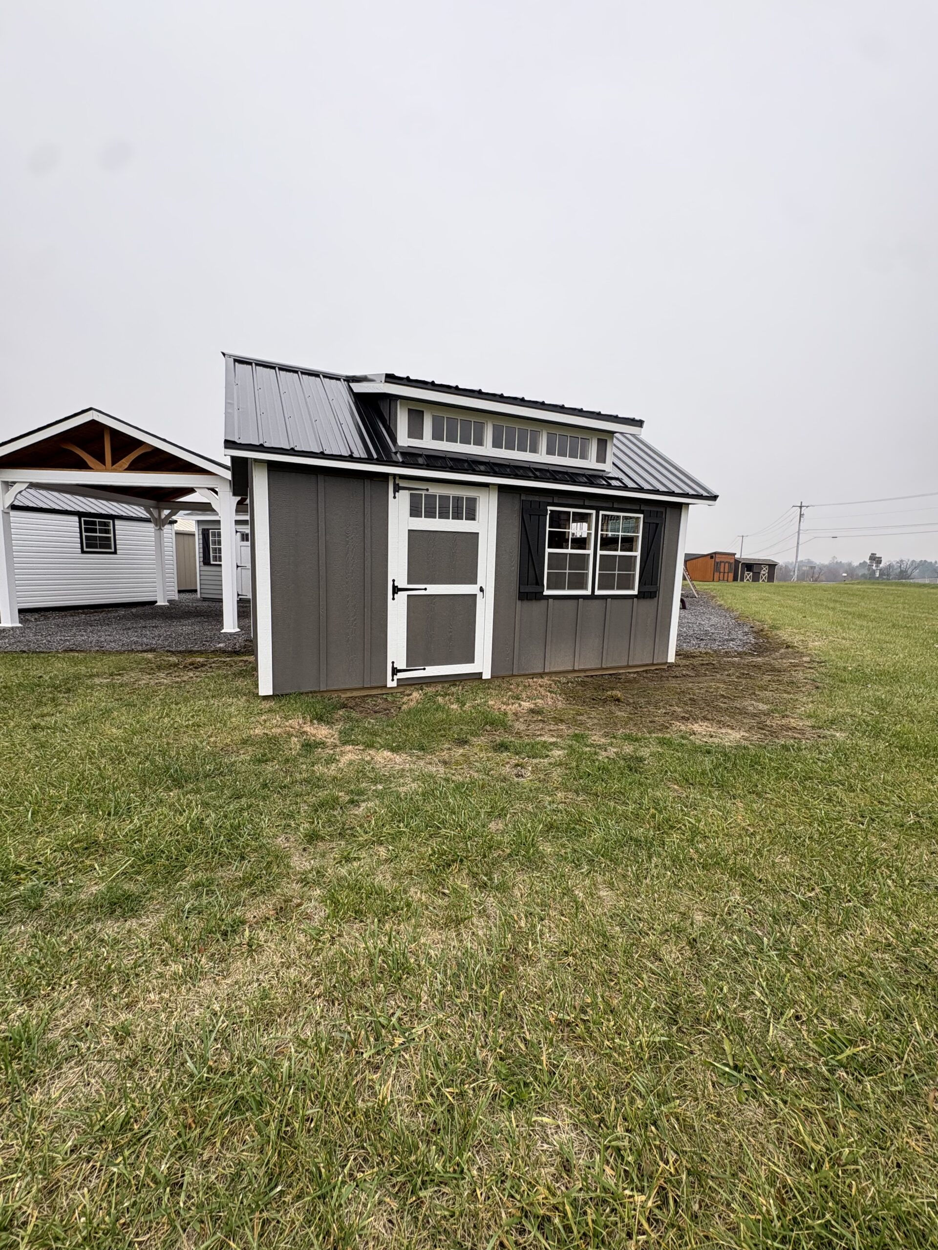 10×16 Cape Cod in Board and Batten Driftwood with white trim Black Shutters and a Black Metal Roof Also comes with One Single door and Two 24×36 Slider Windows One Double door a Dormer and transom Windows above all doors Also comes with 2 Arch top End vents very stunning building.