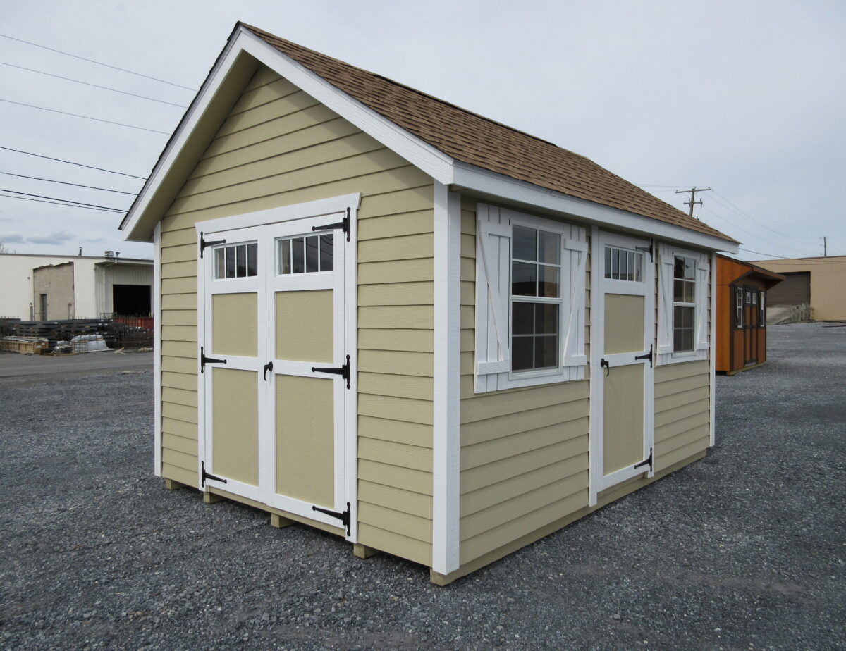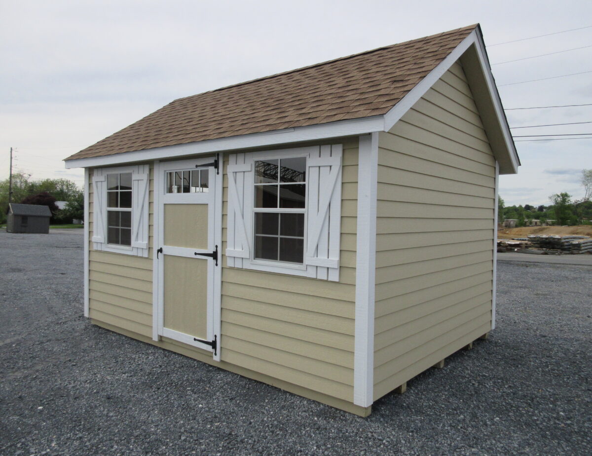 Our Cape Cod series is a practical, sturdy design with a classic appearance. The eye-appeal of this model is enhanced by a steeper roof pitch than the average storage building. Increasing attractiveness, an 8″ overhang on all sides also offers extra weather protection for your structure. Our Cape Cods are available in multiple sizes and come standard with one double door, one 36″ door, two windows with shutters and a shingled roof.