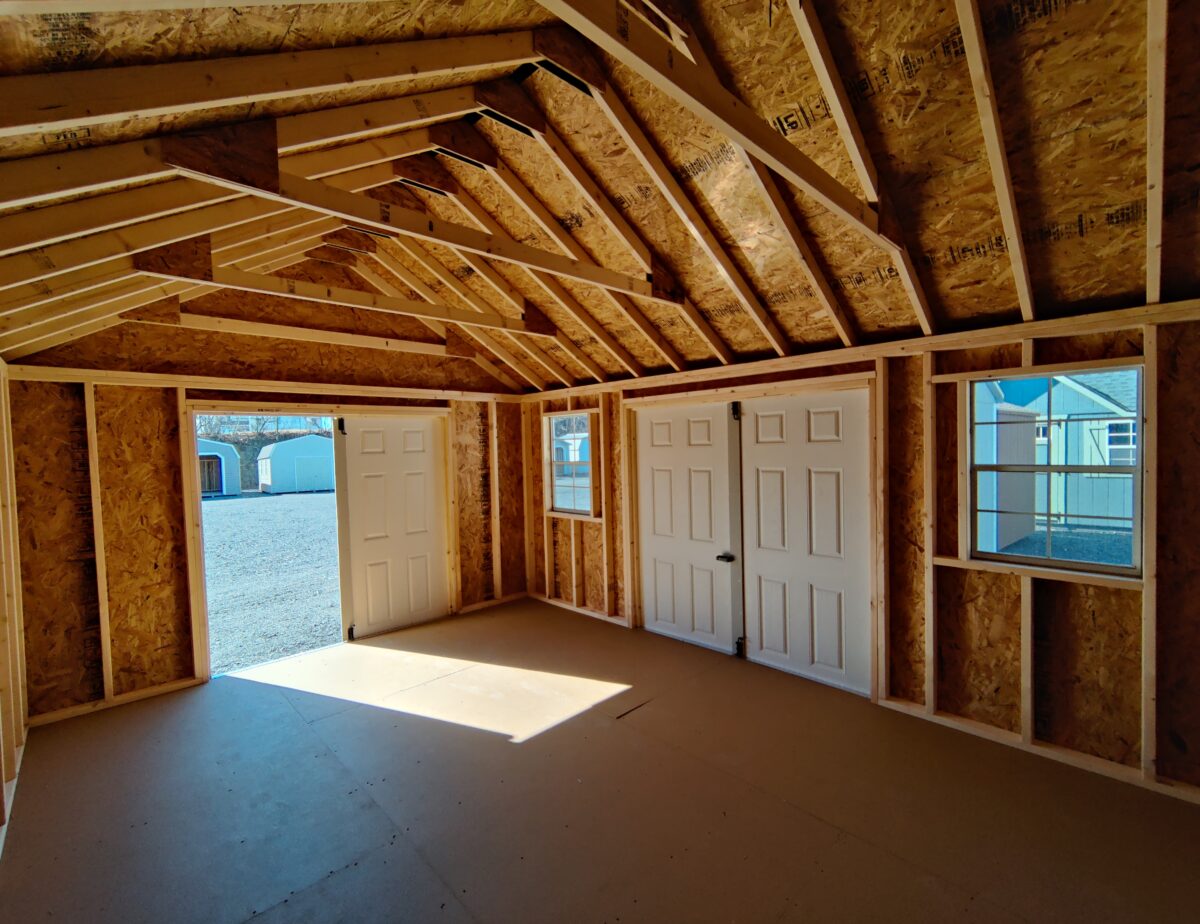 Inside the shed, a bright and open layout offers flexible room for gardening tools, outdoor gear, hobby supplies, or seasonal décor. The balanced placement of two 24×36 white windows adds natural light and gives the structure its signature Cape Cod charm. As a result, the shed feels inviting, organized, and comfortable from the moment you step inside.