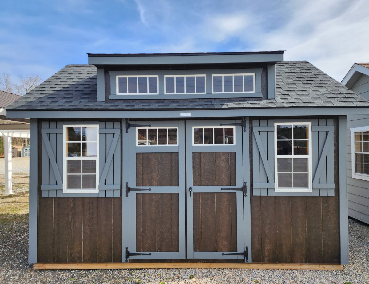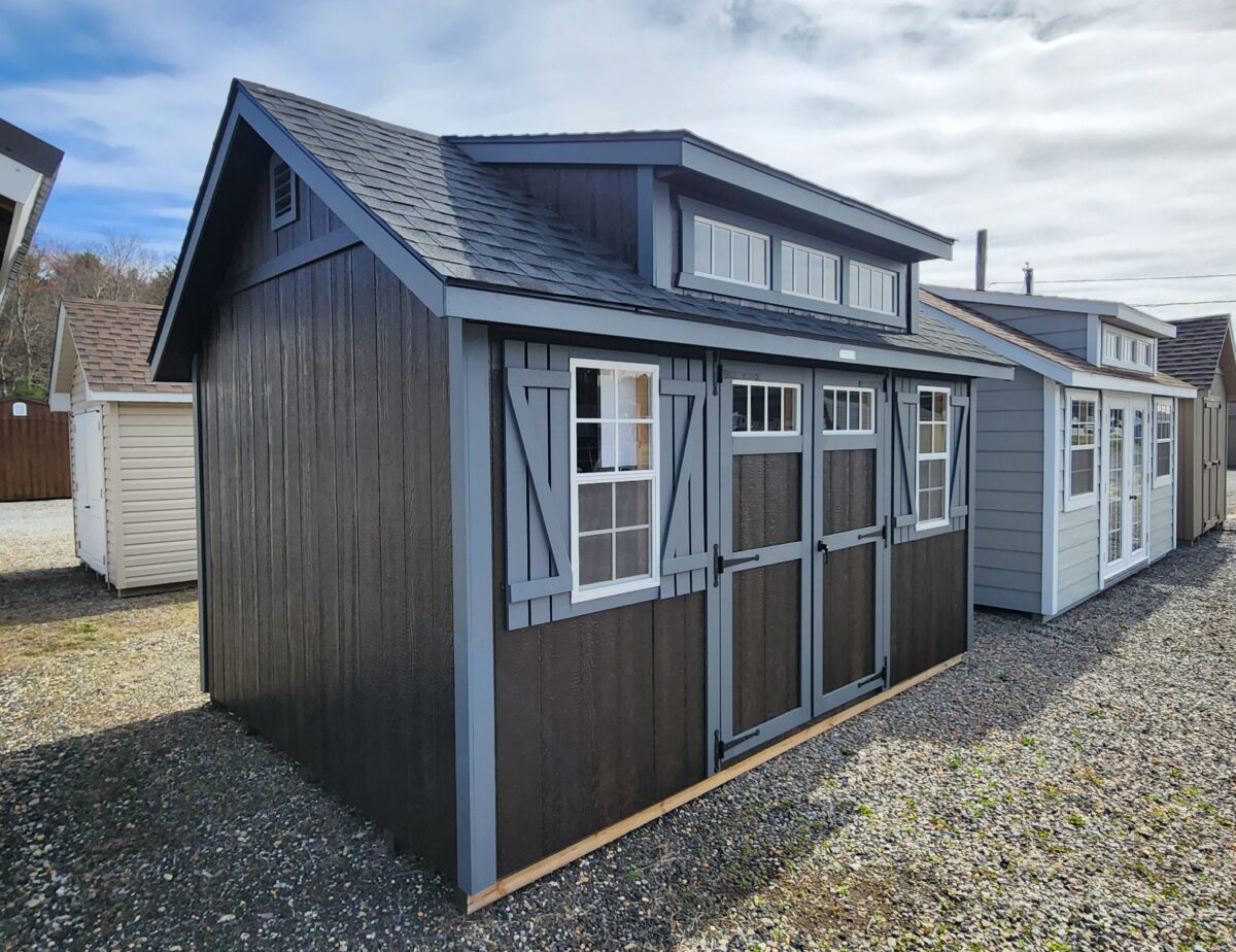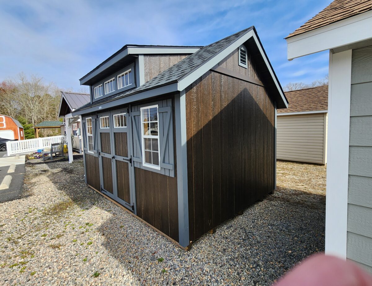 Beautiful 10’x14′ Cape Cod storage building. Two 18″x36″ windows with shutters, 96″ Cape Dormer, offer great looks and storage.