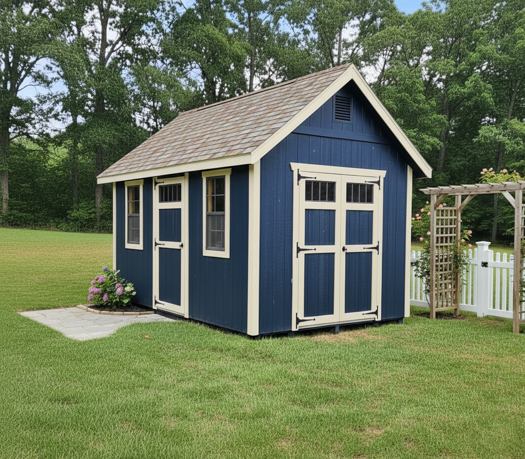 Available at our Hanover location. Stop by and check out this really cute Cape Cod in Midnight Blue LP Siding with Beige Trim. Includes Gable and Ridge Vents for good air flow, 5′ Ramp and Diamond Treadplates for door sill protection. For more information call Erik Waltz or Dennis at (717) 646-0771 or email hanover@pinecreekstructures.com Financing is available at 13.99% for 120 months with a Credit Check. Rent-To-Own is also available.