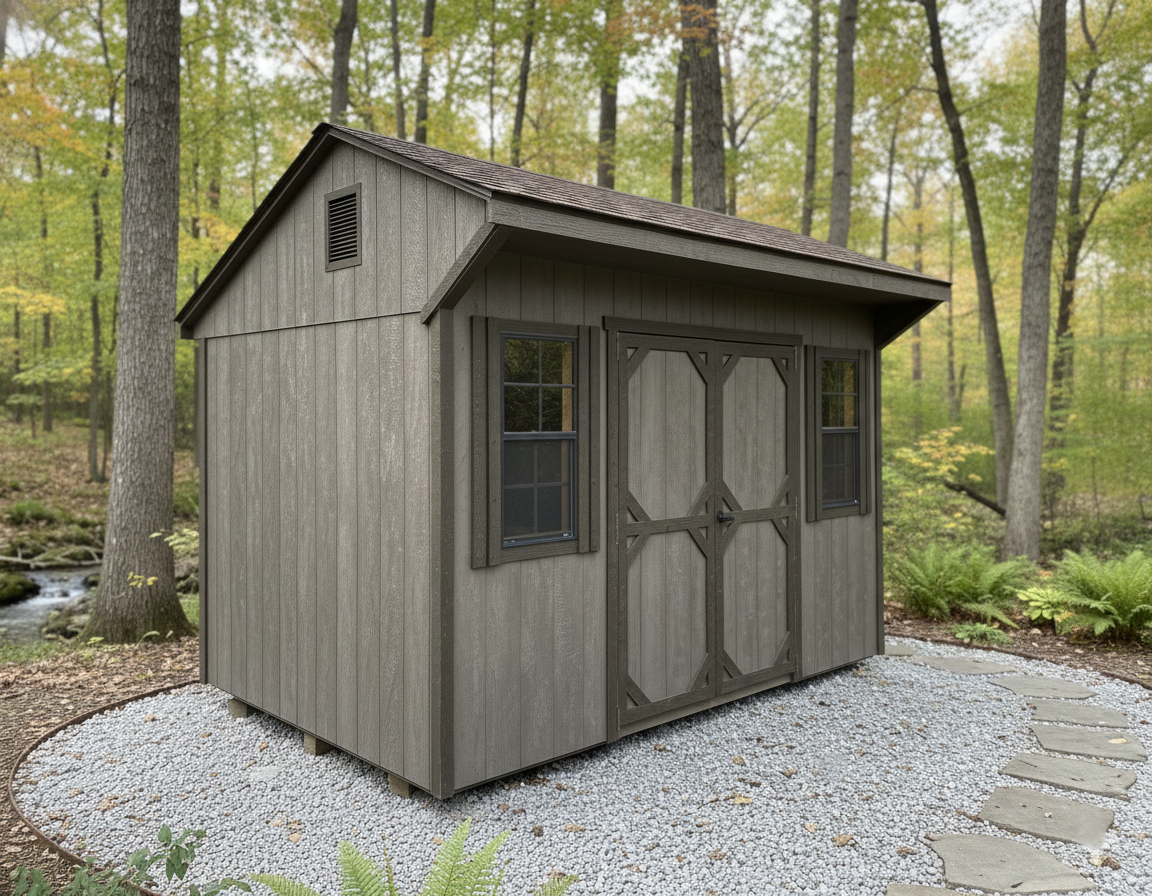 Available for quick delivery from the Hanover store! Super cute 8×12 Cottage with heavy duty construction, Driftwood LP siding and 16″ eave overhang, 2 windows with screens and 5′ wide double doors. For additional information call Erik Waltz or Dennis at 717-646-0771 or emailing us at hanover@pinecreekstructures.com