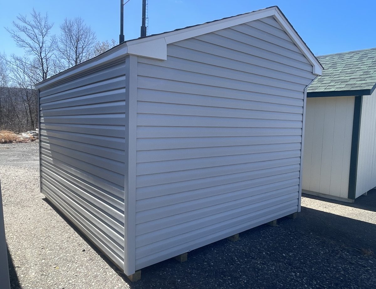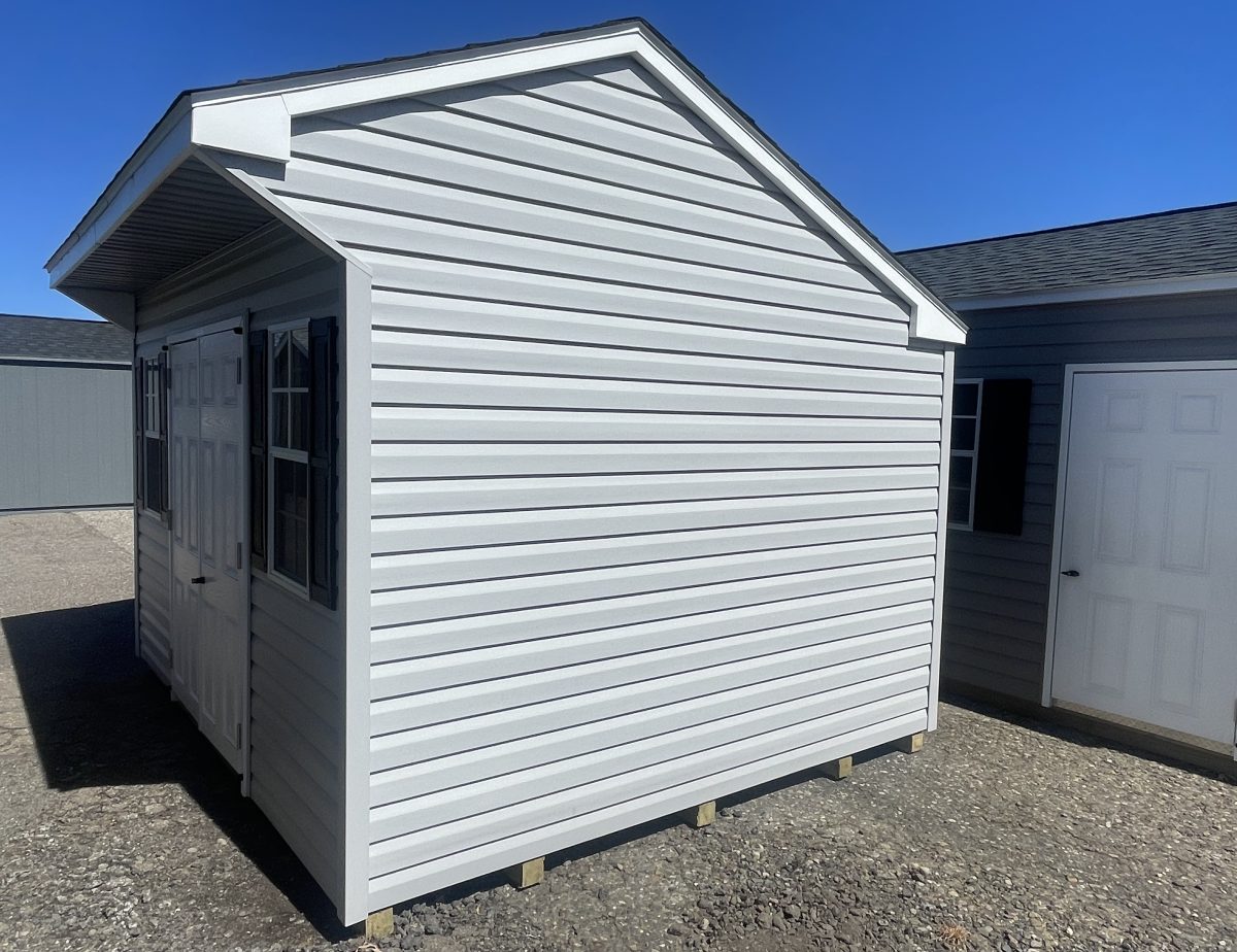 This Amish build maintenance-free vinyl sided 10×12 cottage style shed features an 18″ overhang on the front eave side over the doors and the windows. The off-center roof line gives your building a distinct look to compliment your landscape.