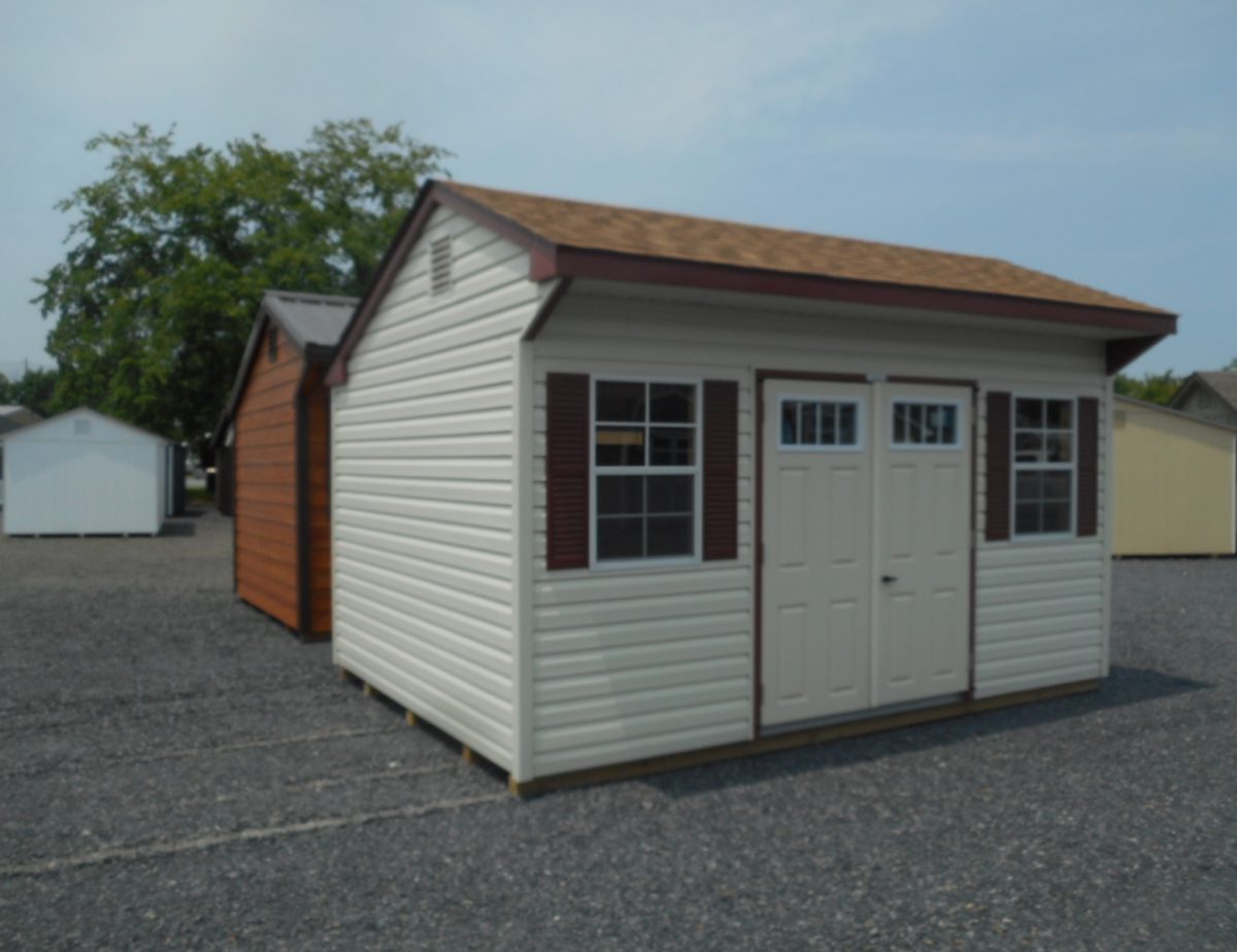 This 10×14 storage shed is located at our Limerick location. Cottage style buildings are very popular as they feature an offset saltbox sloped roof with an 18” overhang on the front side. This structure features low maintenance vinyl siding which will never have to be painted. The 5×6 double doors are centered on the 14′ wall with 2 18×36 single hung windows. We added a row of transom windows to both accent the overall look as well as contribute to the natural light entering inside.