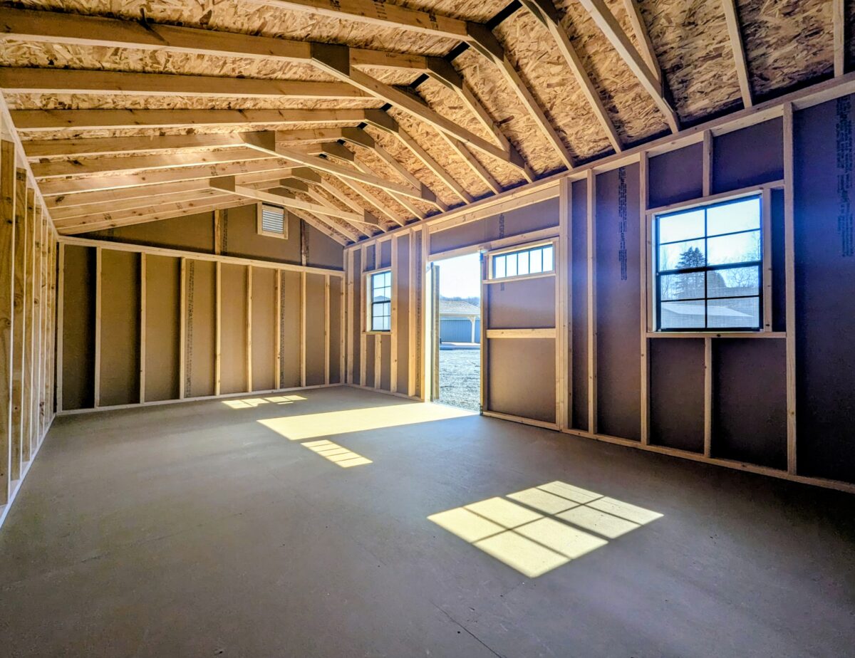 This model features LP SmartSide siding, an engineered material crafted to resist moisture, fungal decay, and impact. It delivers the warm look of wood with reduced maintenance. Felt paper beneath the Rustic Slate shingles adds another protective layer, and a 10′ ridge vent works with the 12×12 gable end vents to support steady airflow throughout the structure. Because consistent ventilation helps control heat and moisture, the shed stays more comfortable and better protected through every season.