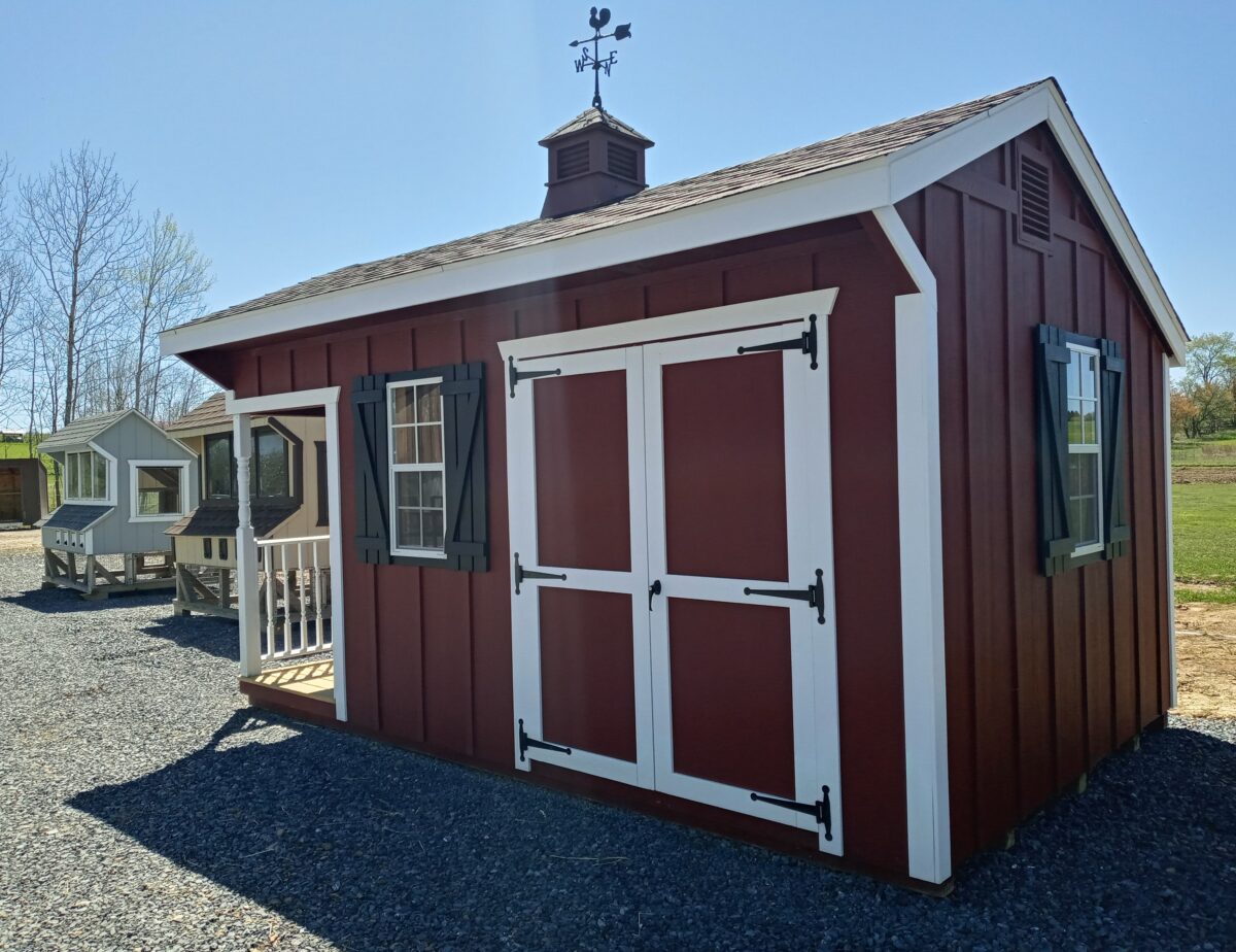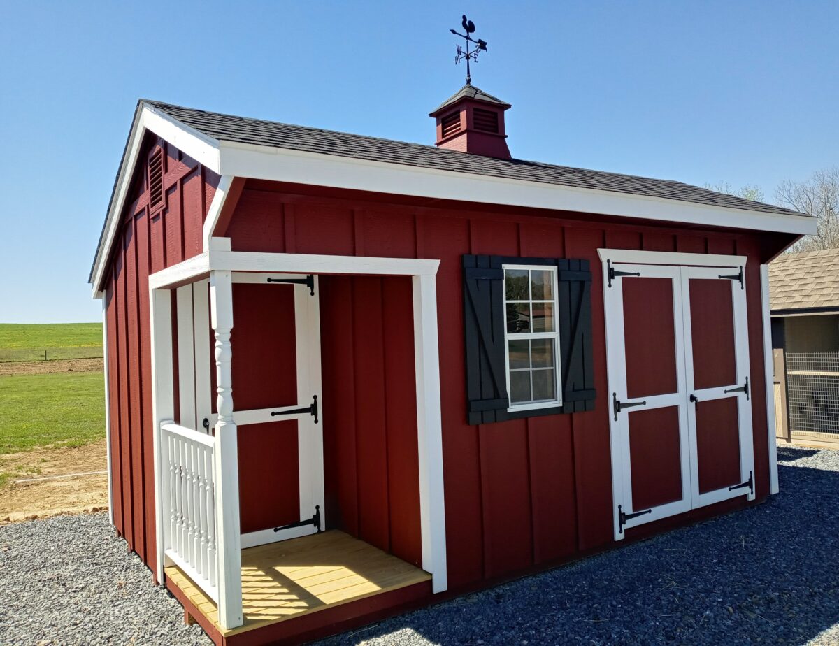 Base Price $6,655.00 Options 2- 12x12 End Vents $44.00 Cupola $160.00 Rooster Weathervaner $88.00 4x4 Corner Porch with railing $609.00 Total Price $7,671.00 Index # MH28914 Colors siding color- red trim color- white shutter color- black shingle color- charcoal Features Free delivery first 20 miles! 10x16 Building 5x6 double door opening 2- 18"x36" windows Print Page