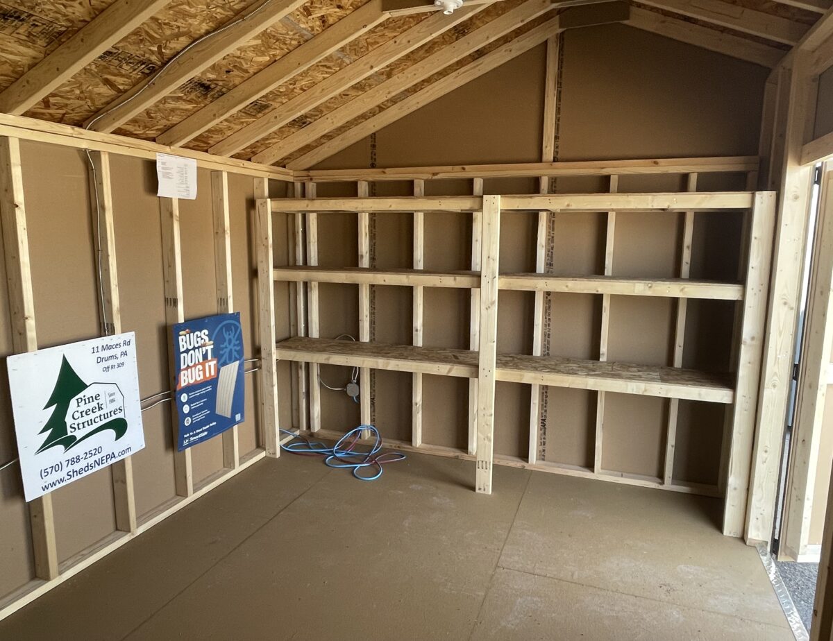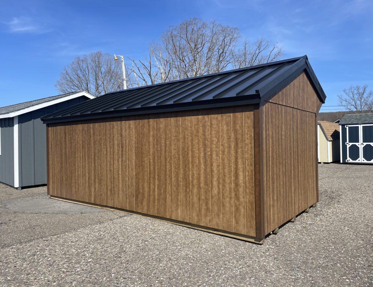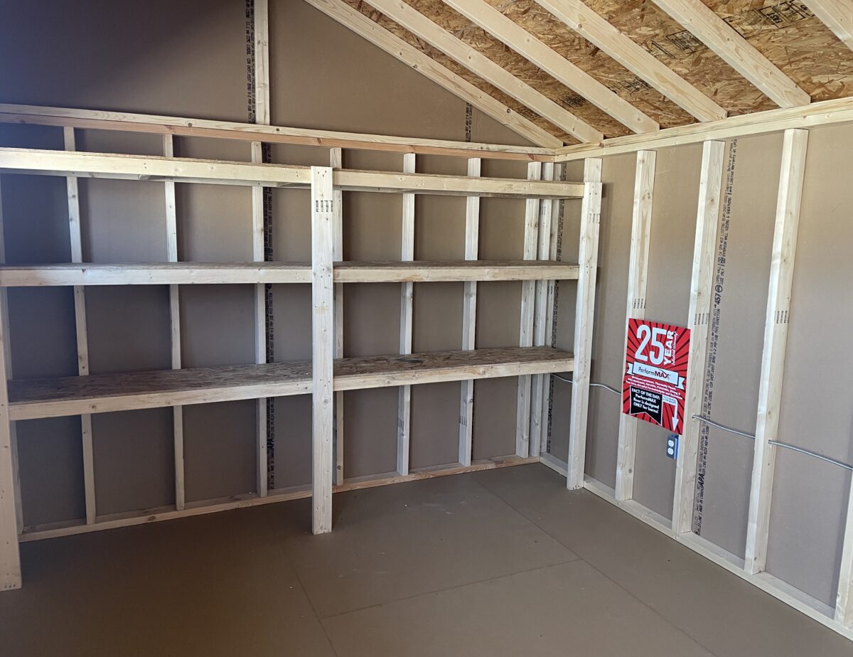 With this Amish built 10×20 cottage style shed features an 18″ overhang on the front eave side over the doors and the windows. The off-center roof line gives your building a distinct look to compliment your landscape. We added two of our most popular upgrades to this shed: shelving, electrical, metal roof, a diamond tread plate at the doorway and ridge vent.