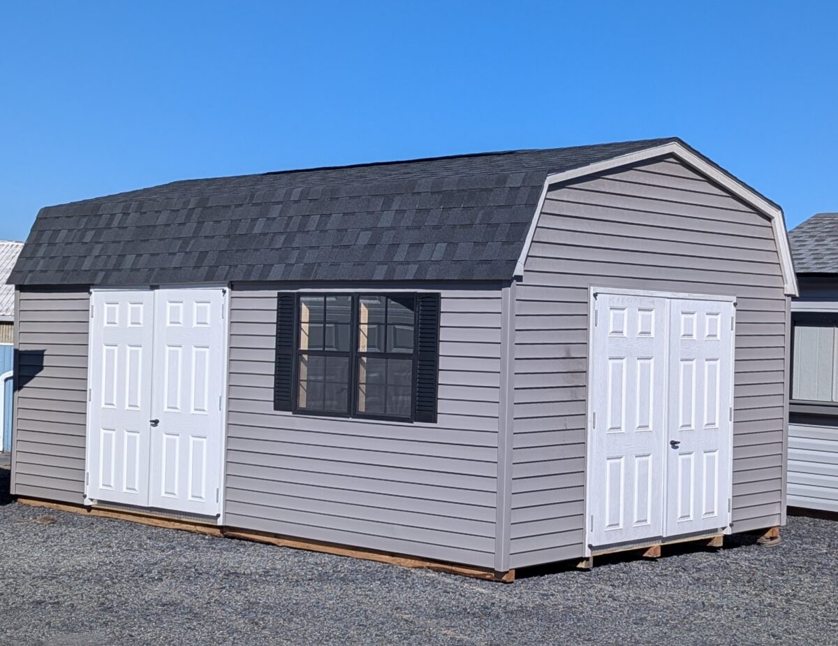 The 12×20 Vinyl Dutch Shed is built for strength and everyday use. Its gambrel roof gives the structure a tall interior, so you get more usable headroom than a standard A-frame. The Graphite Gray straight-lap vinyl siding pairs with clean White trim and Black shutters, creating a bold, rugged look that fits into a wide range of properties. Since the shed includes two sets of 6×6 double doors, you can access the interior from either side, which makes loading and unloading simple.