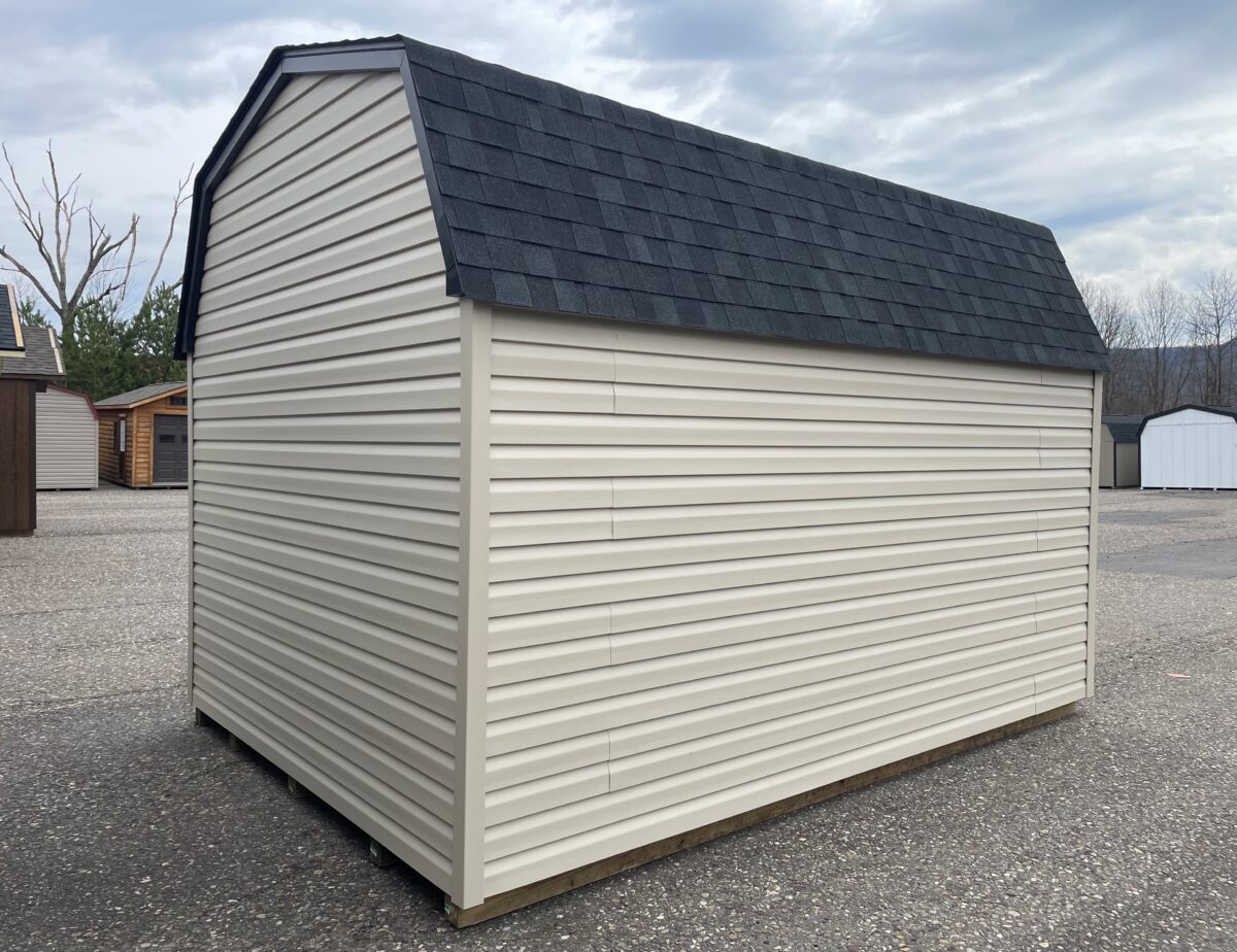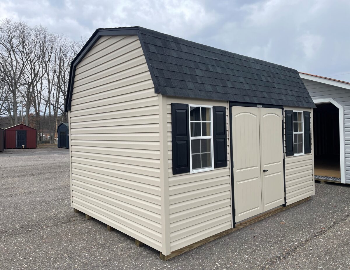 This Amish built maintenance-free vinyl sided 10×14 Dutch Barn storage shed is ready to be put to work storing and protecting your belongings. A diamond tread plate at the doorway adds extra protection to the area while the shingle-over ridge vent increases airflow. We also built two overhead lofts.