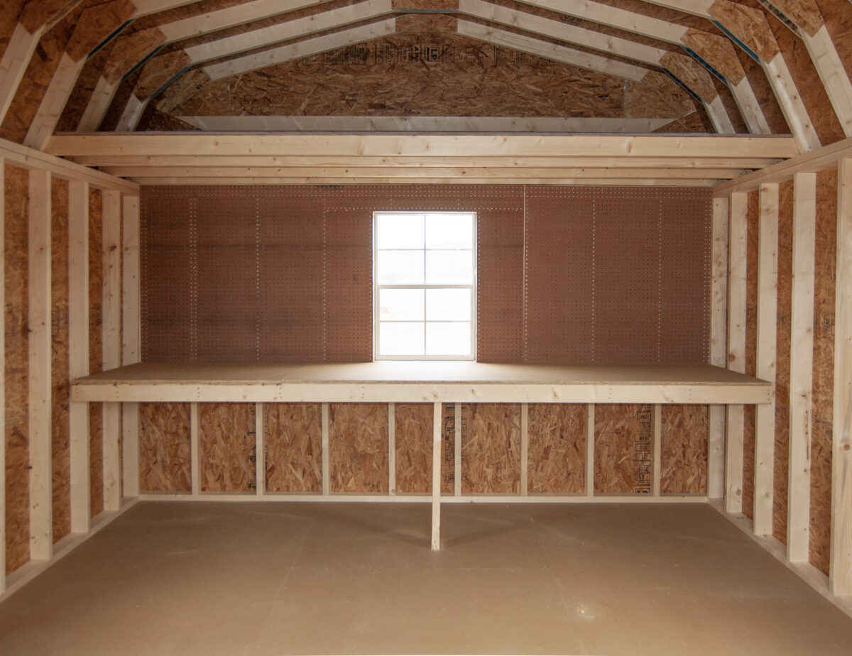 This storage shed is ready to be put to work storing and protecting your belongings. A diamond tread plate at the doorway adds extra protection to the area while the shingle-over ridge vent increases airflow. We also built two overhead lofts and a workbench with pegboard behind it. Ask about our Rent To Own and Financing programs.
