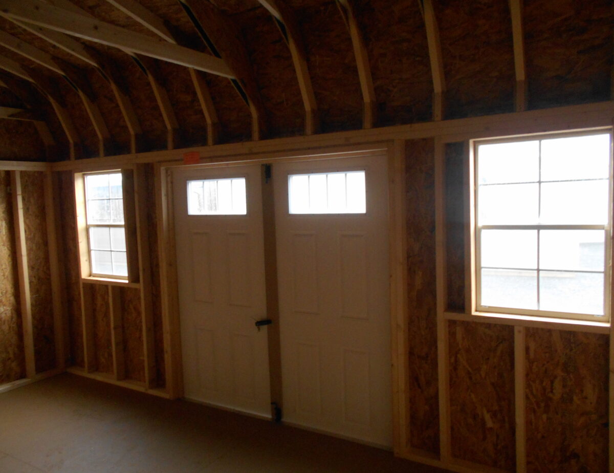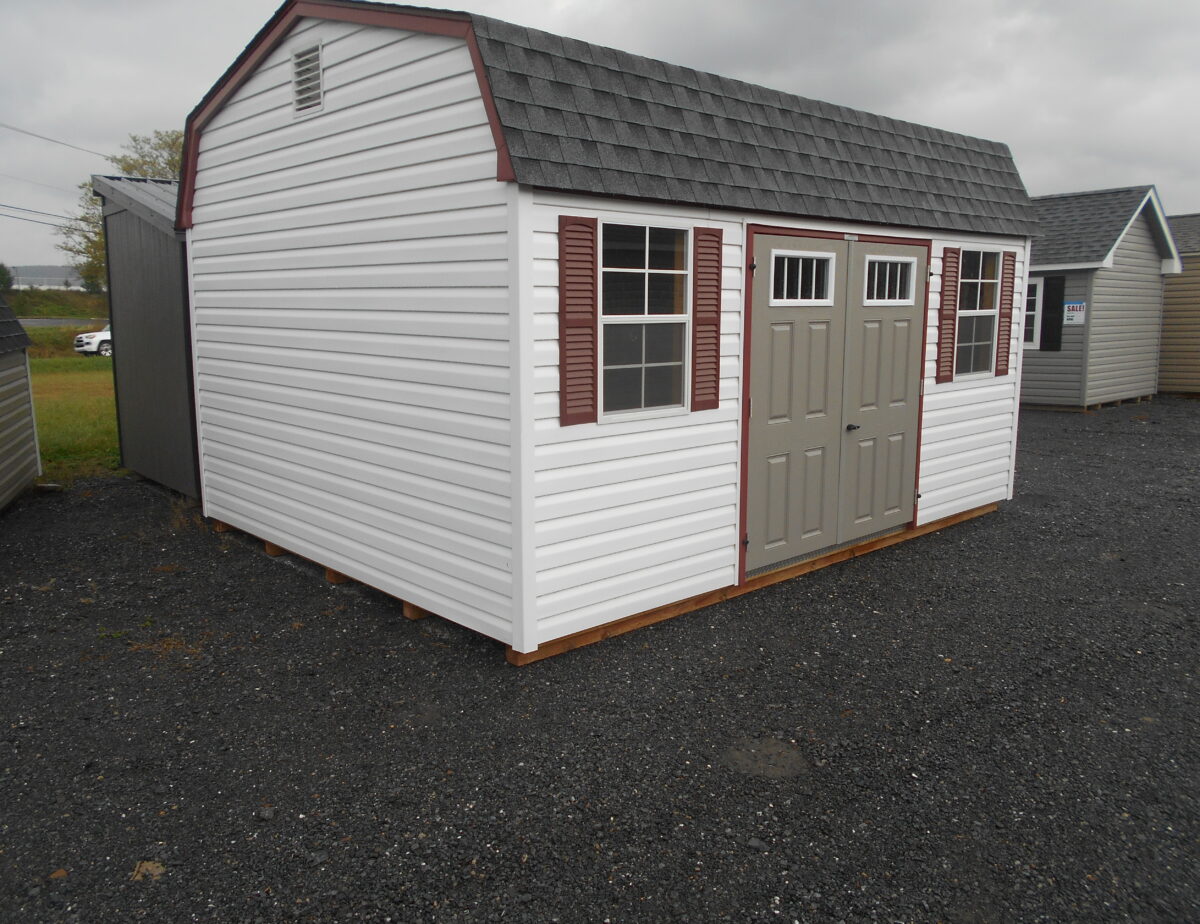 This 12×16 Vinyl Dutch features white siding, Red trim and red shutters also comes with a Charcoal colored shingle roof. One 6′ Charcoal Grey double sided door, Two 24×36 white slider style windows, Four lite transoms in the door also comes with a 16′ long loft and a upgraded 2×4 floor 8″ oc. Comes with two 12×12 end vents, 16′ vented eves a6′ diamond plate. Perfect for storage with a little extra room to work with.