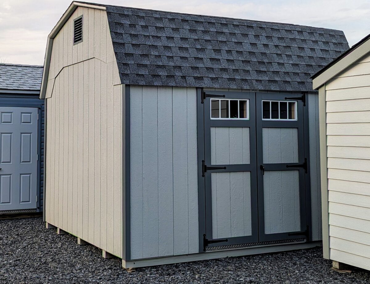 The 10×12 Dutch Barn Shed delivers dependable storage with the familiar look of a gambrel roof. Its Light Gray LP SmartSide siding pairs with Dark Gray trim to create a clean, practical appearance. Because of the barn roof design, the interior feels more open than a standard A-frame, which gives you extra headroom for easier movement and better long-term flexibility.