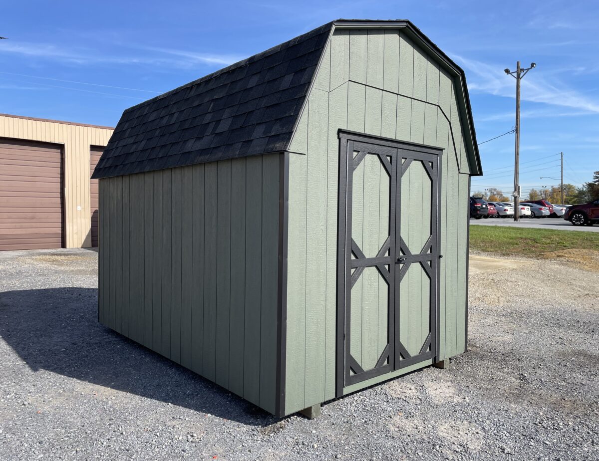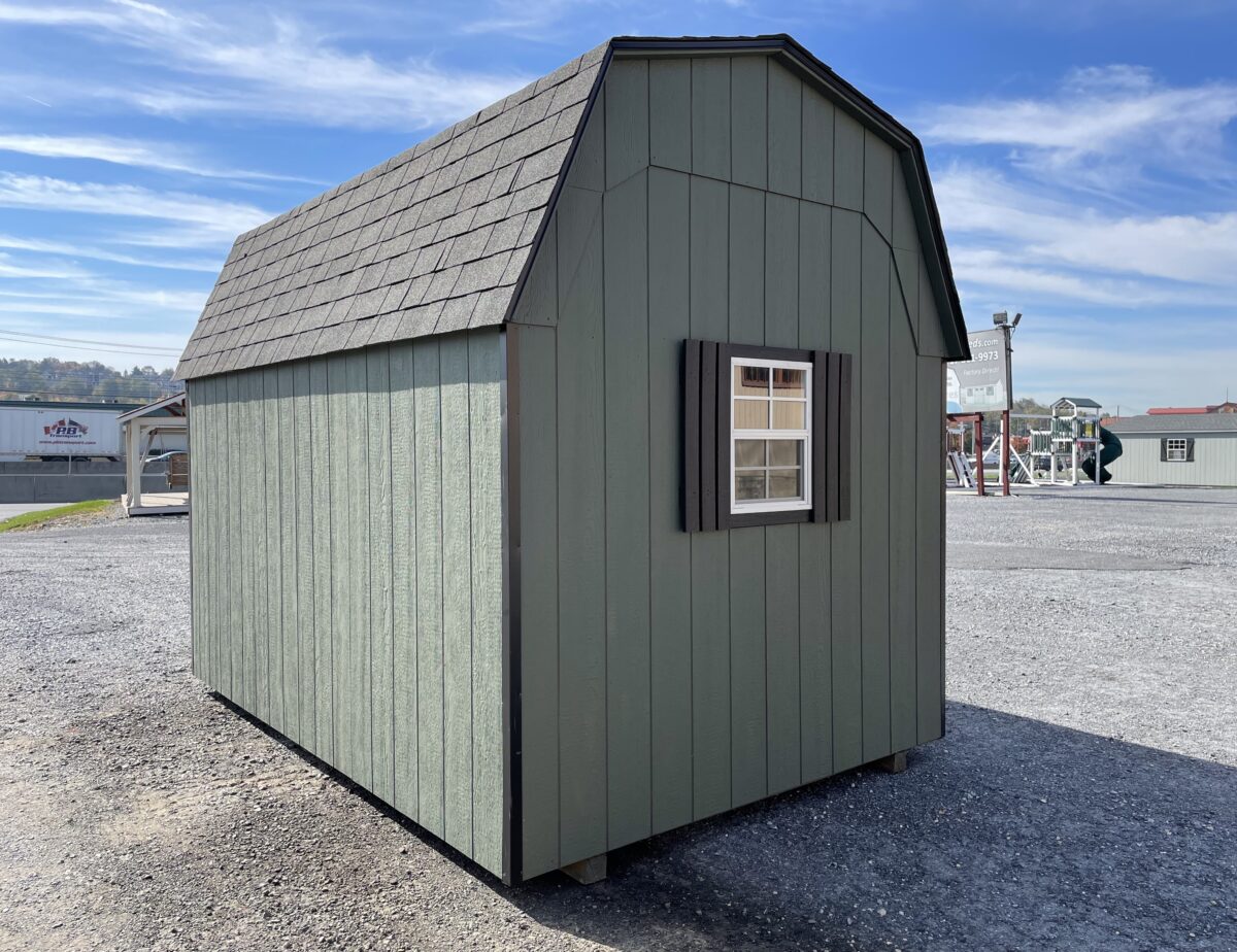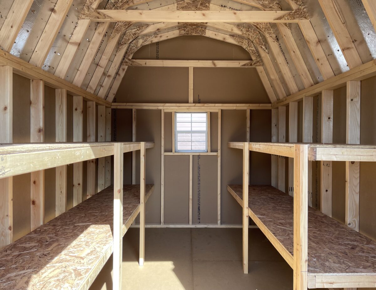 Our Highwall Dutch Barns are not quite as tall as our Dutch Barns but still give you plenty of room for overhead storage. The 70″ tall walls accommodate hanging tools or bikes along the sides. All Highwall Dutch Barns come standard with one double door and one 18″x23″ window with shutters. Wall space can also be utilized by installing optional shelving for smaller items. We can also install overhead lofts, which are great for storing seasonal items.