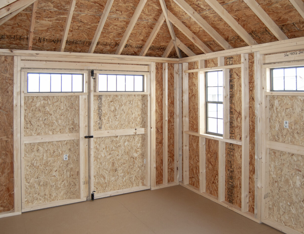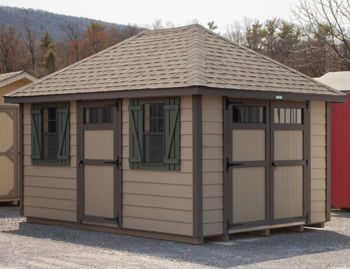 Our Hip Deluxe style storage sheds have a unique appearance with a 4-sided roof slope, 8″ roof overhangs, wide face boards, and New England style door hardware. We also added transom windows to the doors for added natural light inside.