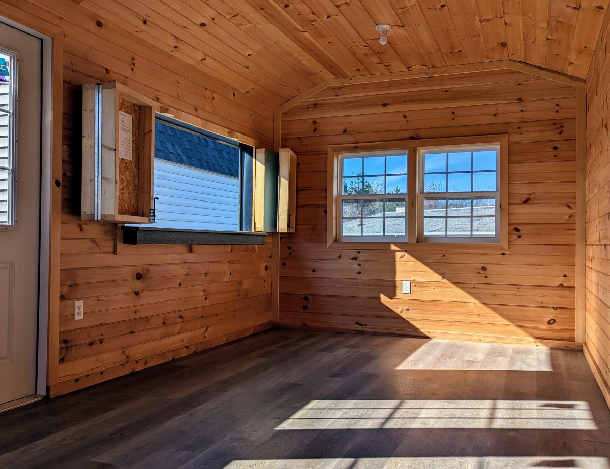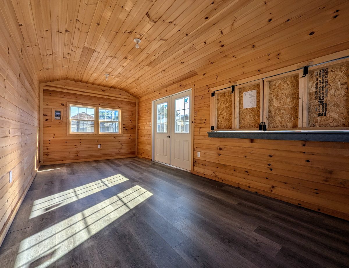 This model includes R-11 insulation in the walls, floor, and ceiling, so the interior maintains a more consistent temperature. Pine interior walls add warmth and character, while the laminated flooring provides durability and easy upkeep. The electrical package includes a 60-amp panel, shop lights, outlets, and the wiring needed for entertainment equipment, tools, or appliances.