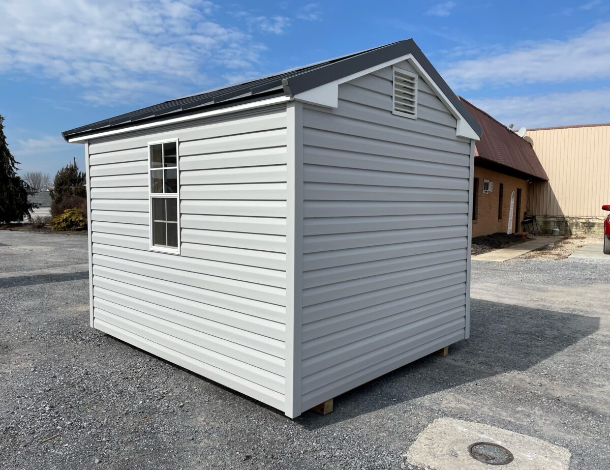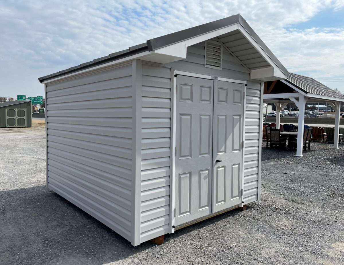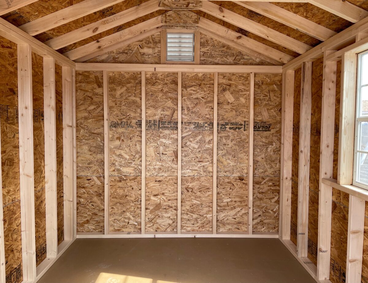 Our Front Entry Peak sheds come standard with 2″x4″ construction 16″ OC, a 5/8″ coated engineered floor, a double door, one window with shutters, a 16″ roof overhang on the gable end above the doors and a shingled roof. All 6′ wide buildings include one 36″ door, one window with shutters, a 16″ roof overhang on the gable end above the door and a shingled roof.