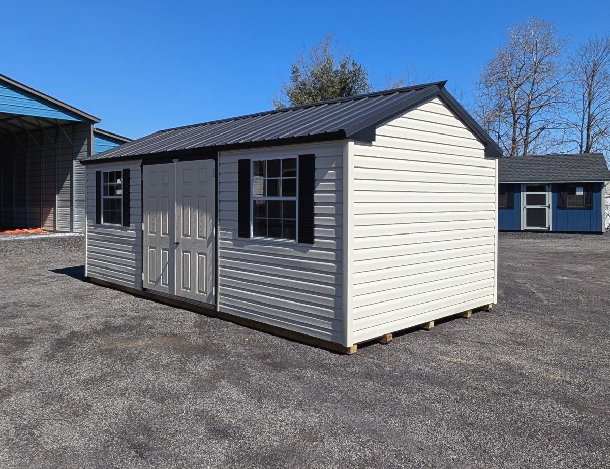 The 10×20 Peak Shed offers dependable storage and a clean, home-friendly look with a durable black textured metal roof. This roof includes double-bubble insulation, which helps manage heat and reduces condensation. As a result, the shed remains more comfortable through changing seasons. The Classic Sand vinyl siding pairs with Black trim and shutters, creating a timeless, sharp contrast. With these features together, the 10×20 Peak Shed delivers strength, style, and long-term value for your property.
