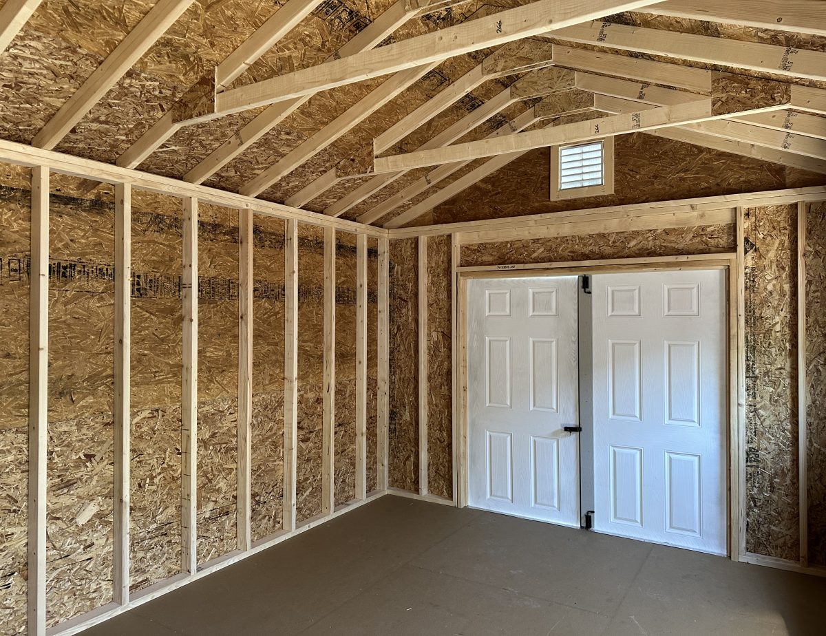 This 12×16 shed is located at our Berlin location. Being 192 square feet, no building permit is required. This shed has 6×6 fiberglass doors on the 12′ gable end, and a single fiberglass door with 2 24×36 windows on the 16′ wall.