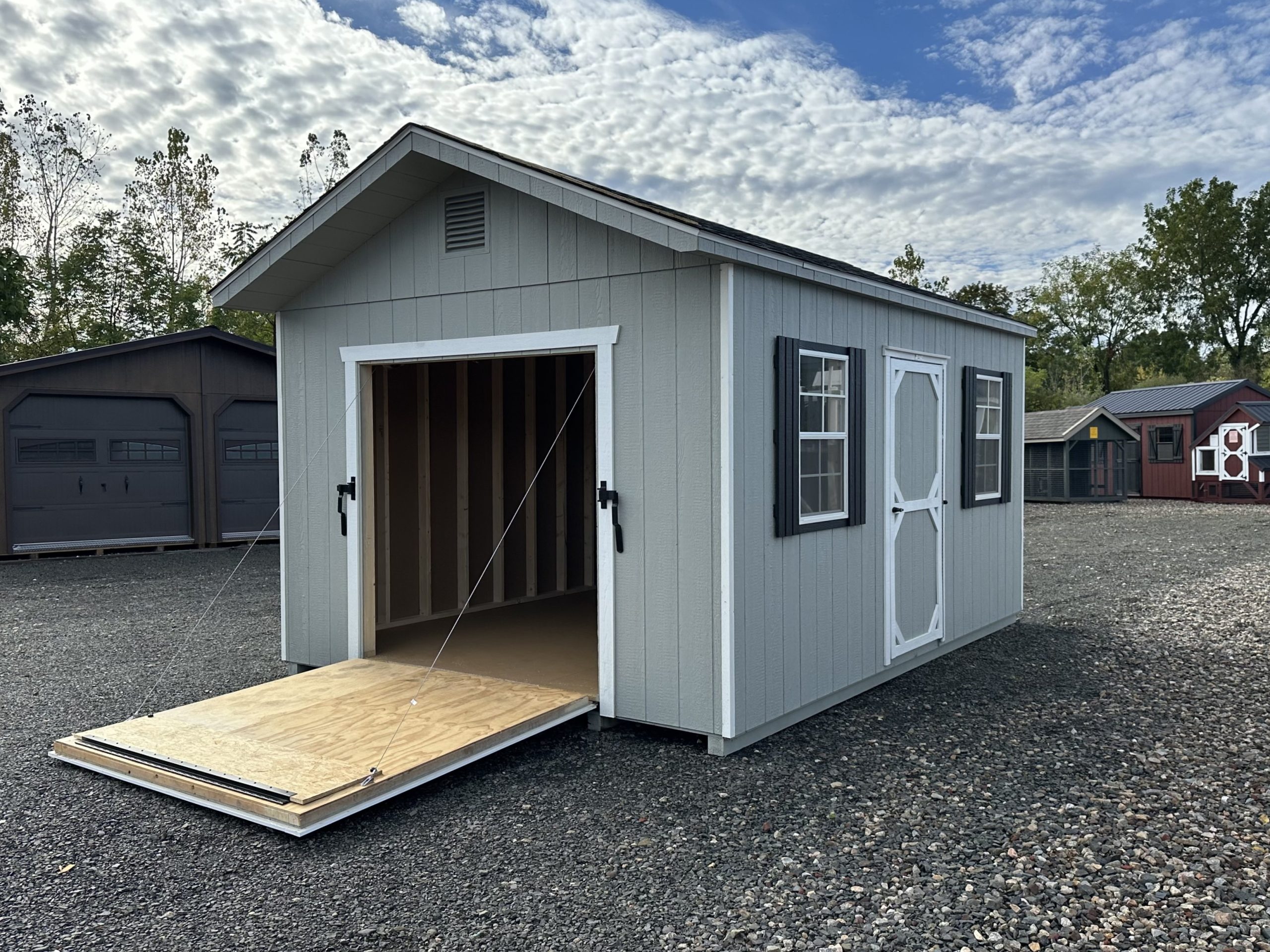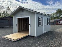 This 12×16 A-Frame style storage shed is located at our Berlin retail store. This structure, being 192 square feet in size, does not require a building permit in CT. This shed has a 6×6 Rampage door on the gable end of the structure which has a 1,500 lb weight rating, and basically makes you the coolest kid on the block. Looking at the Rampage door there is a 3×6 single entry door with 2 windows on the right side. With 50 year LP smart siding, lifetime Tamko shingles, and a 25 year PerformMax floor, this building is built to last. Being the manufacturer you also have the option to order a shed and choose any style, size, color scheme, and layout.